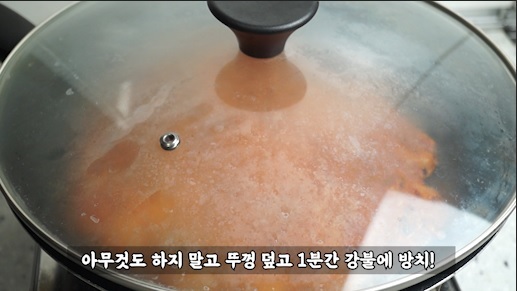 4. 뚜껑을 덮고 강불 유지하고 1분간 그대로 방치, 뚜껑은 팬 크기와 딱 맞는걸 사용하세요.