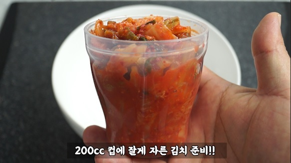 1. 적당히 익은 김치를 잘게 잘라 200cc 컵에 1컵을 준비하세요. 마트에 파는 종가땡 김치 정도만 되도 충분히 맛있는 김치볶음밥이 됩니다.