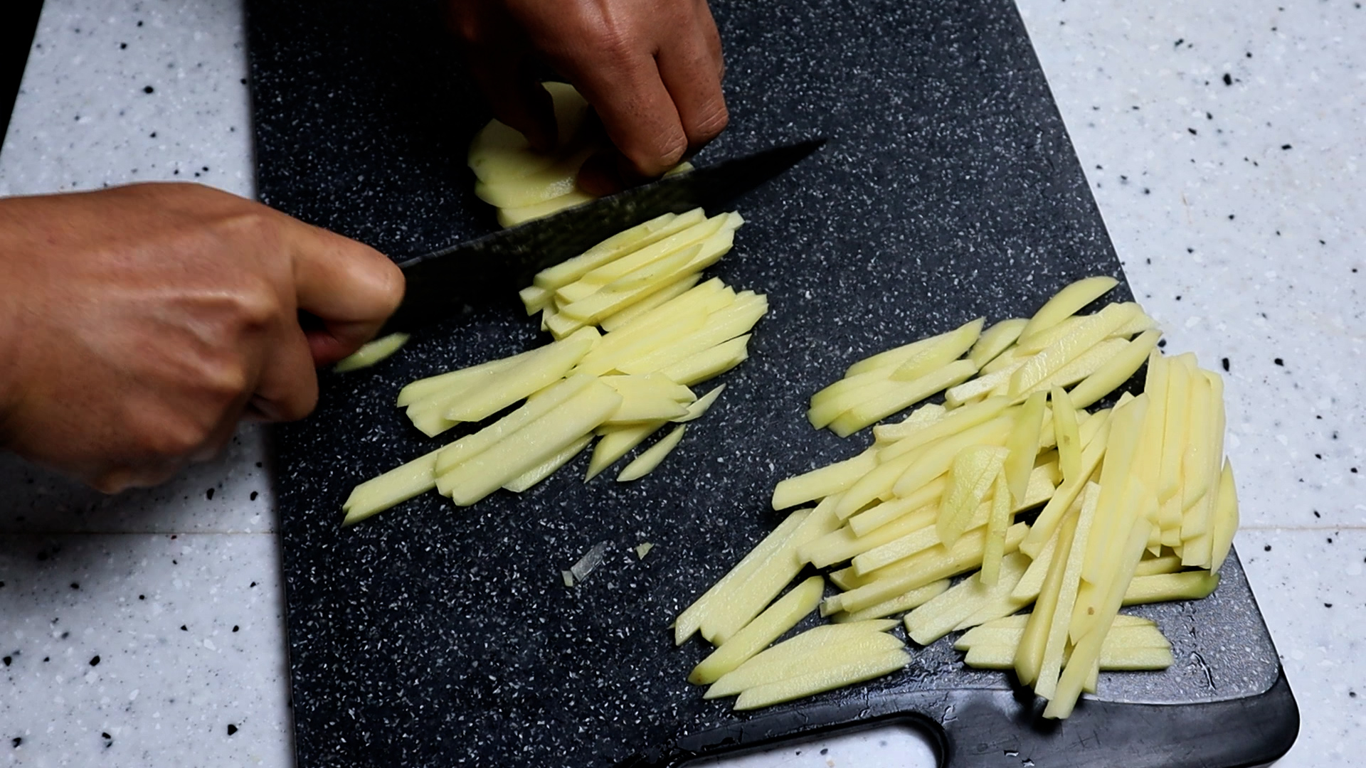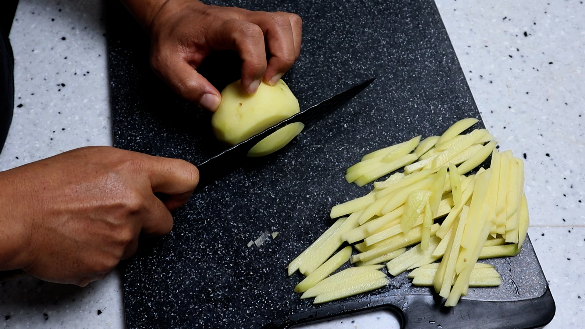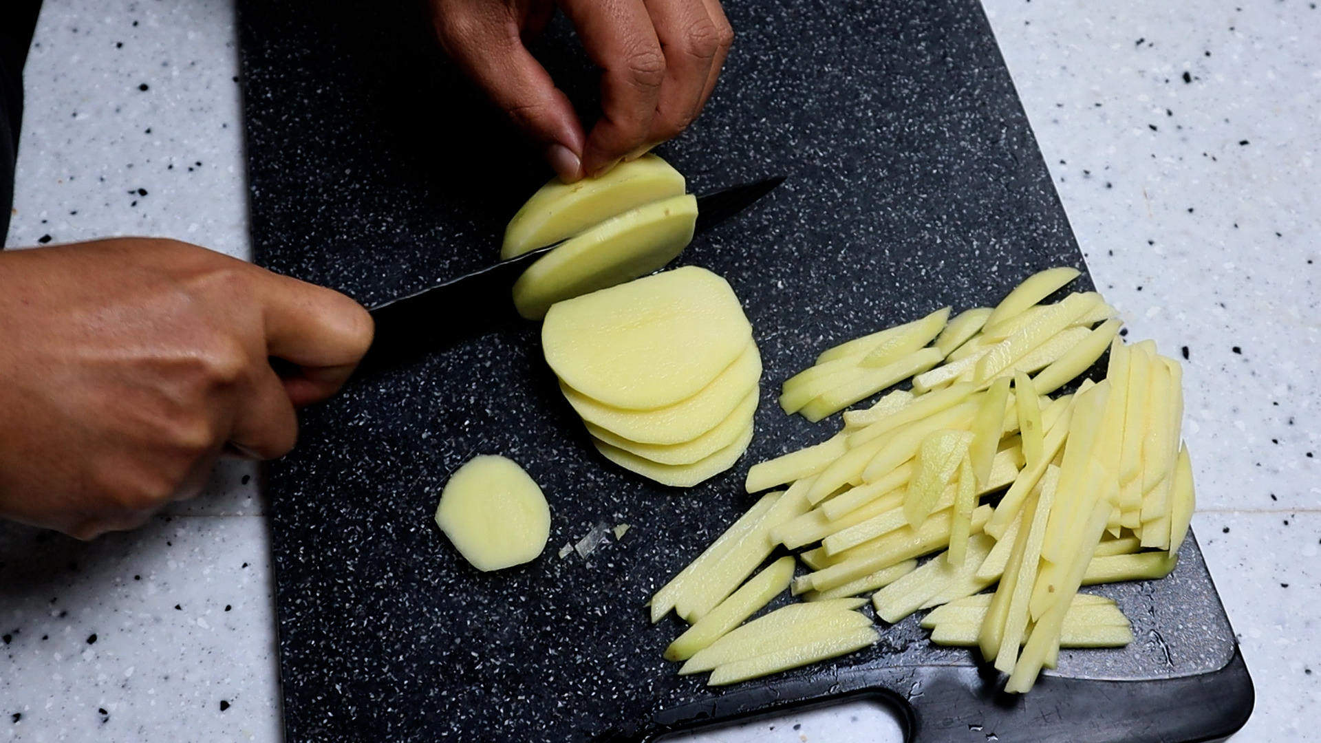 4. 평평한 면을 도마에 세우면 울퉁불퉁 감자가 흔들리지 않고 안정적으로 썰수 있습니다. 감자는 0.5cm 정도 두께로 썰어주세요.