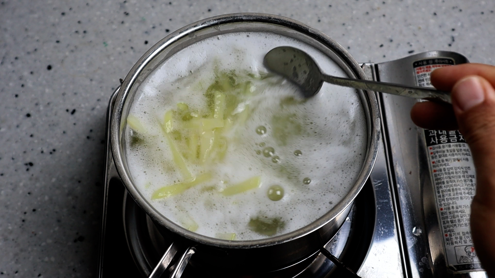 12. 감자는 채반에 부어 끓인 물은 전부 버려주세요.