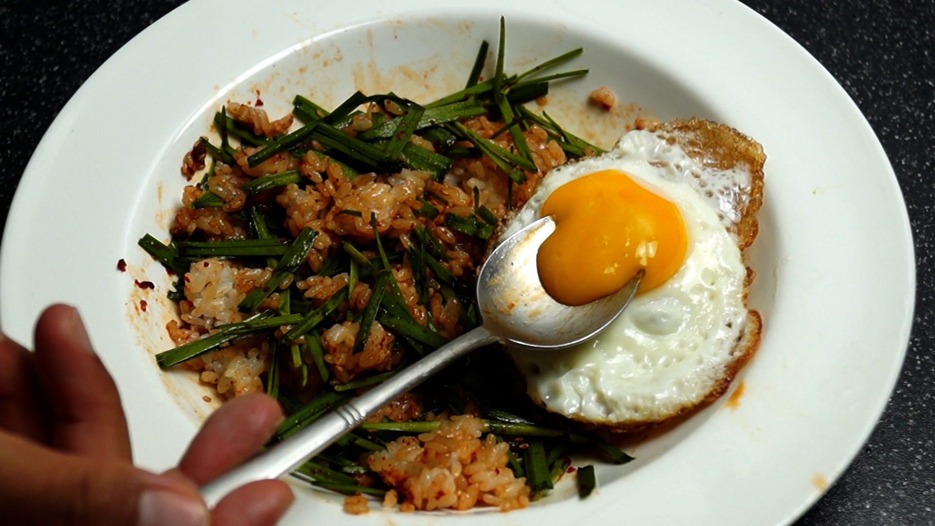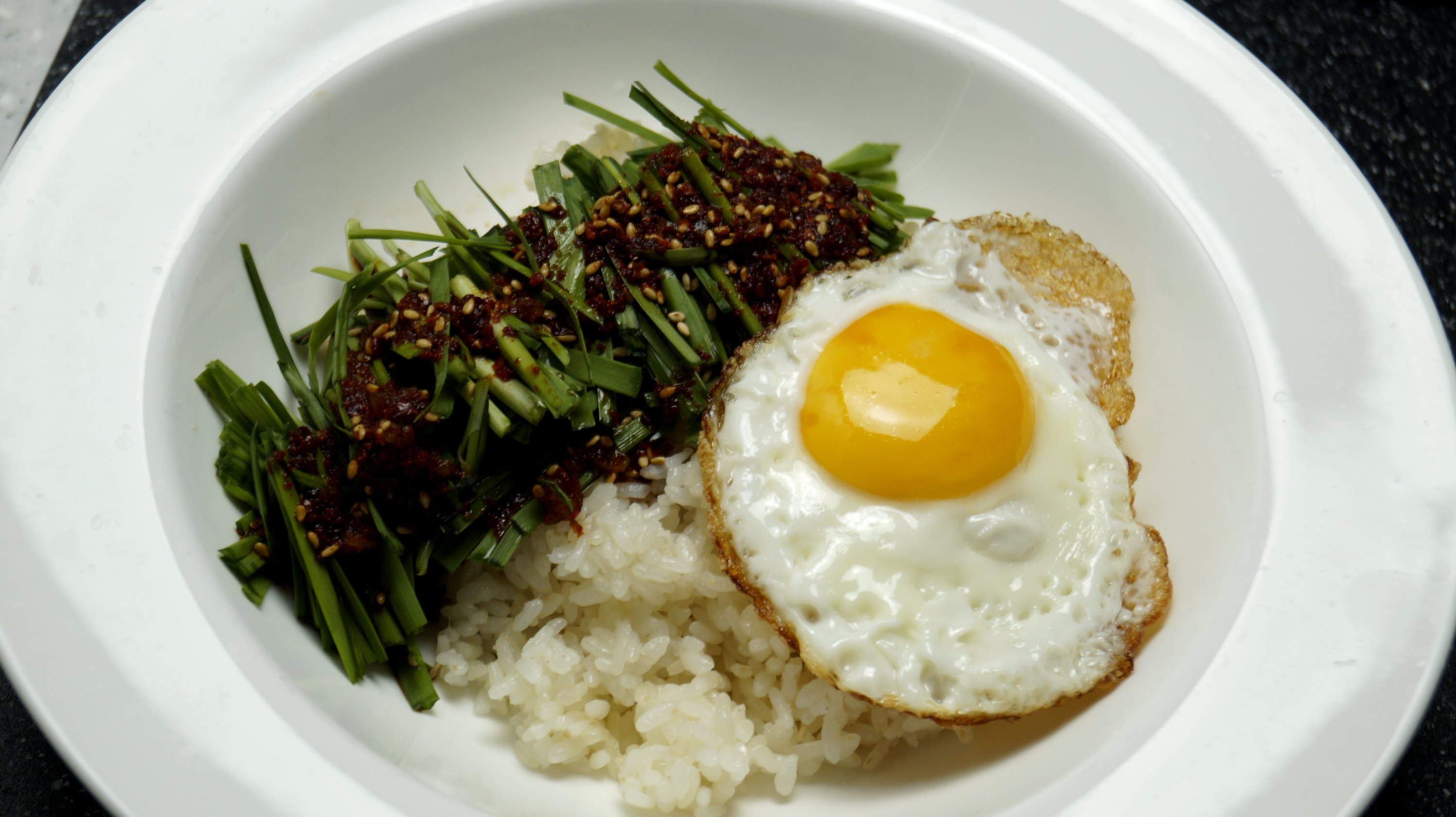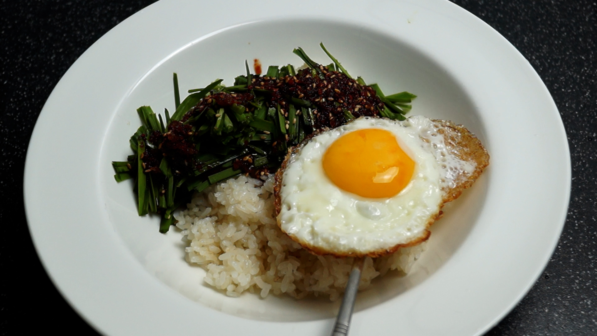 18. 꾸덕한 노른자 살포시 떠서 비빈 밥하고 같이 드셔보시면 고소한 맛에 단짠한 양념! 아삭한 부추식감이 정말 잘 어울릴거에요~