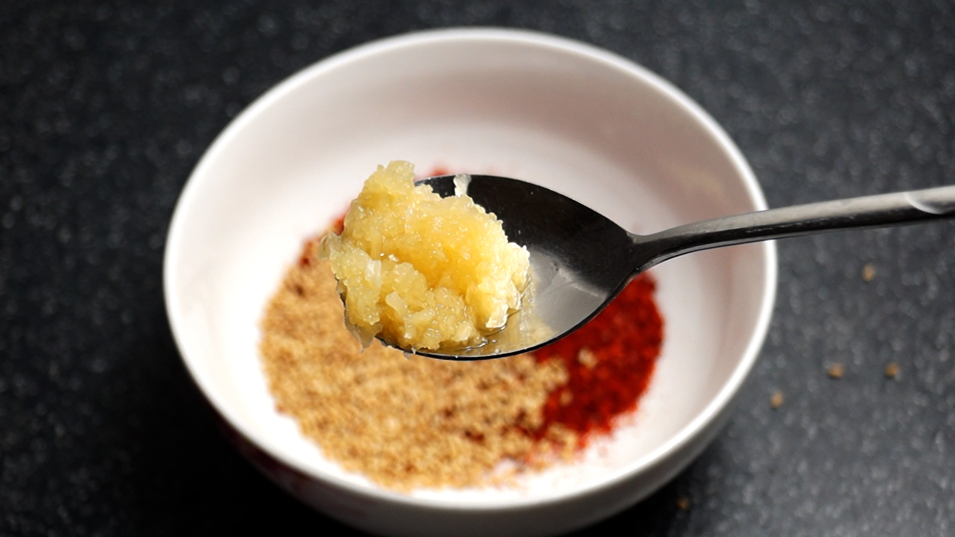 4. 간마늘 반스푼 10g 칼로 다지면 입자가 너무 커서 나중에 마늘이 씹히는 맛이 강하게 날수도 있으니 곱게 간마늘 사용하시는게 좋아요~