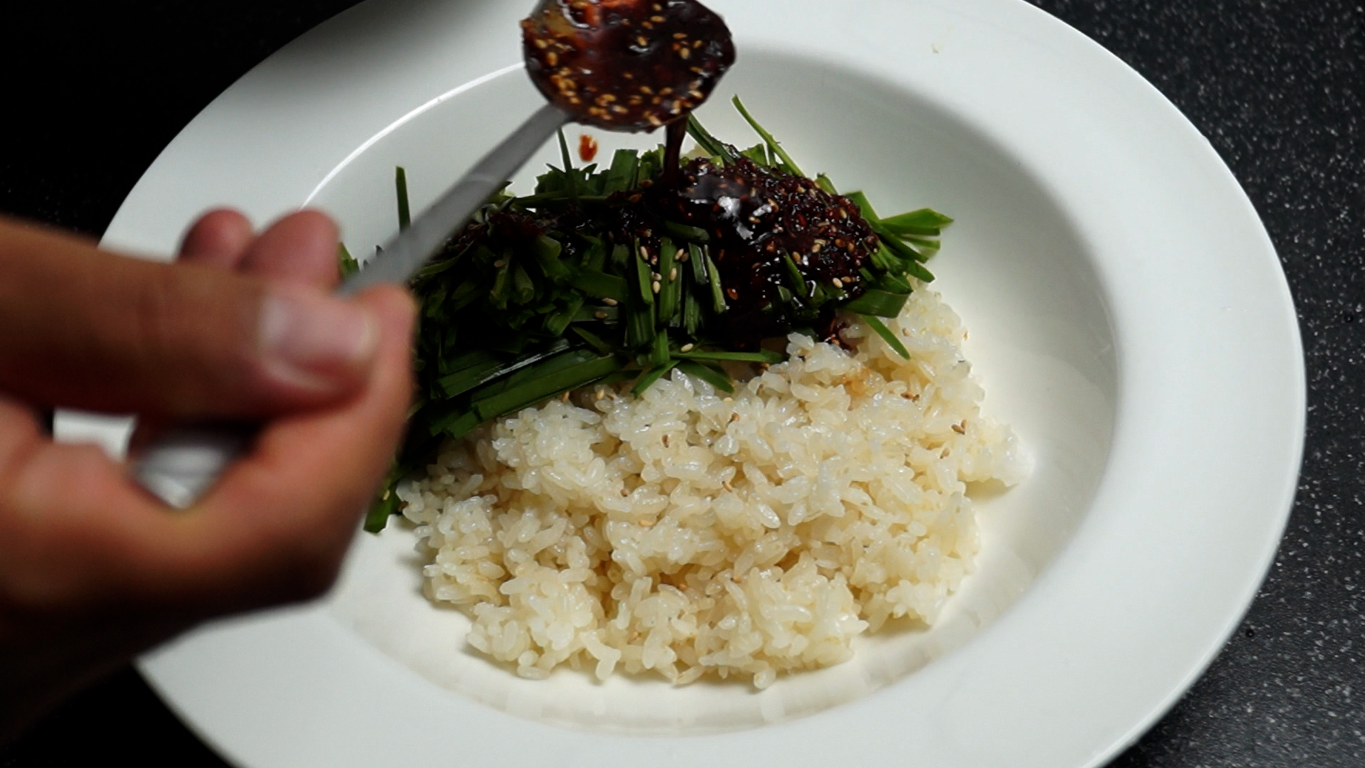 14. 깨끗하게 씻은 부추 1줌 대략 25g 을 2~3cm 그기로 밥 한쪽에 잘라올려주세요.