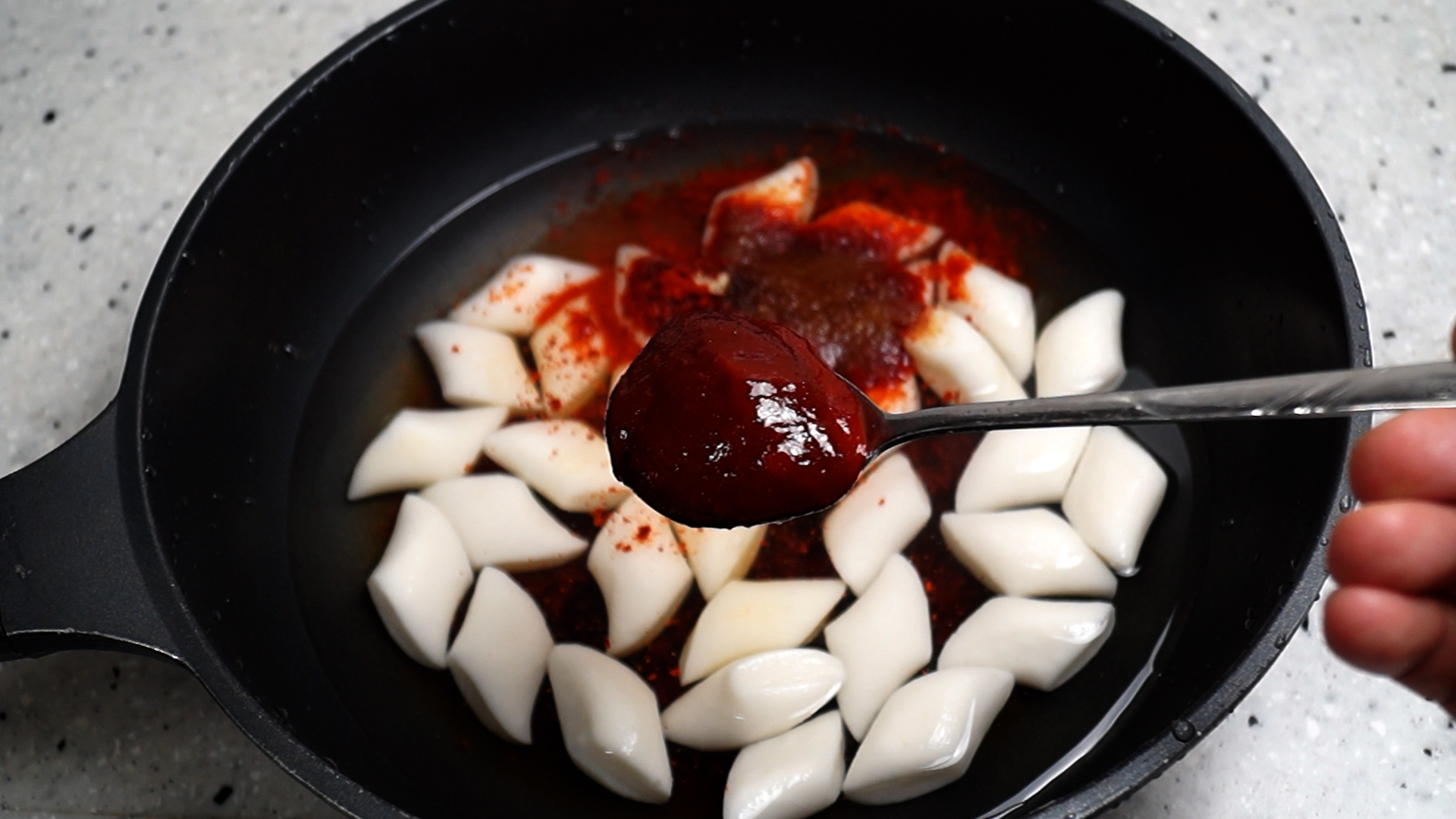 2. 떡볶이 떡을 냄비에 넣어주시고 물 2컵 400cc 를 부어주세요. 냉동떡을 사용하셨으면 물을 추가해서 끓이는 시간을 늘려주세요.