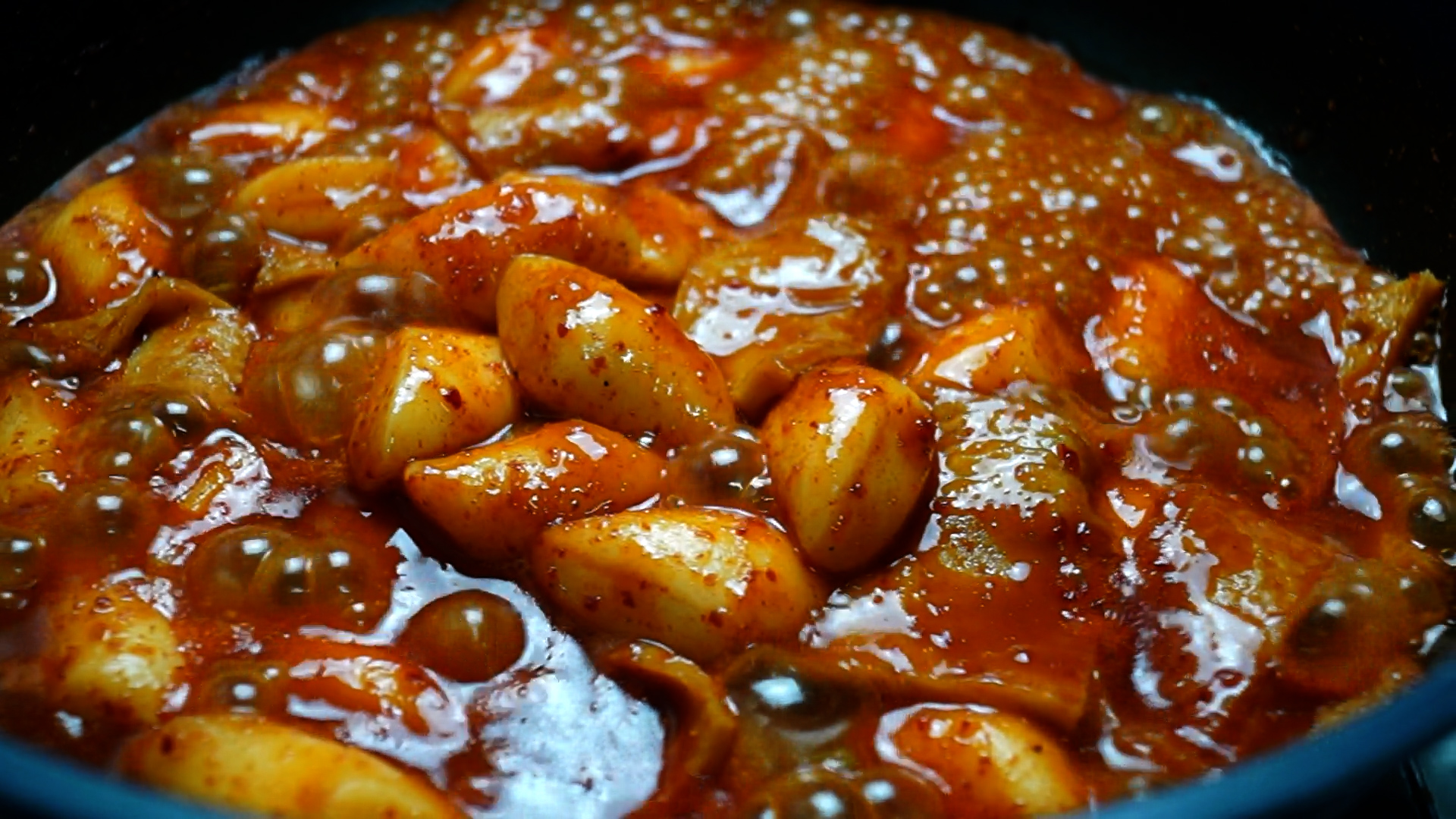 11. 불을 올리고 부글부글 끓기 시작하면 불을 중불로 바꾸고 5~6분 정도 천천히 저어가면서 끓여 줍니다. 중불에 뭉근히 졸이면 떡에 있는 전분기가 빠져나와 소스가 한층 꾸덕해져서 소스가 알맞게 떡에 들러 붙을 뿐 아니라 떡에도 양념이 베어들어 맛이 한층 더 좋아진답니다~