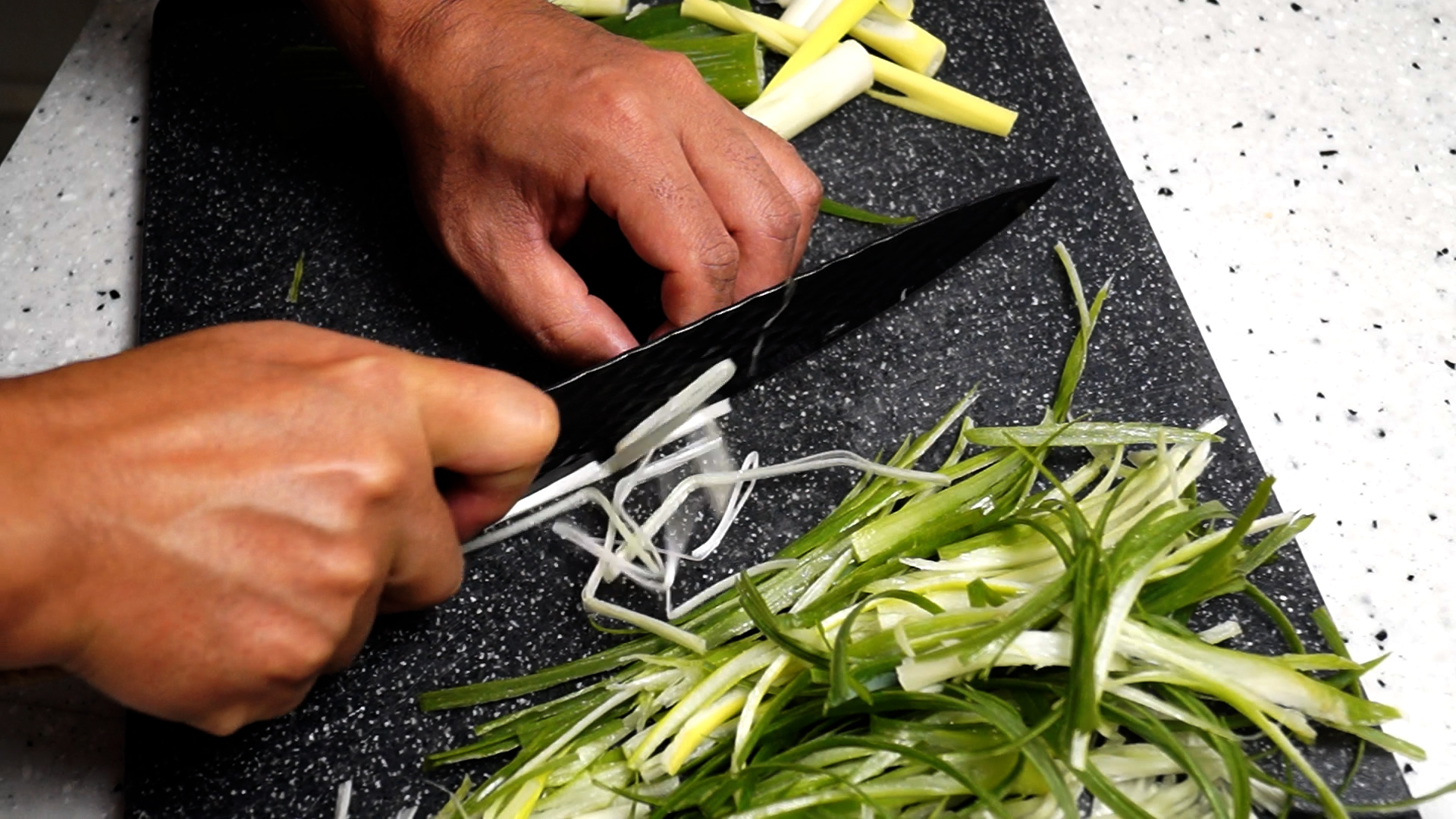 1. 대파 40g 을 길쭉하게 채썰어 주세요. 길쭉하게 채를 썰어야 나중에 면 건져 먹을때 골고루 건져 먹을수 있습니다.백원 짜리 굵기 정도 되는거 반대 정도니 참고하세요~ 좀 많이 들어가도 괜찮아요~