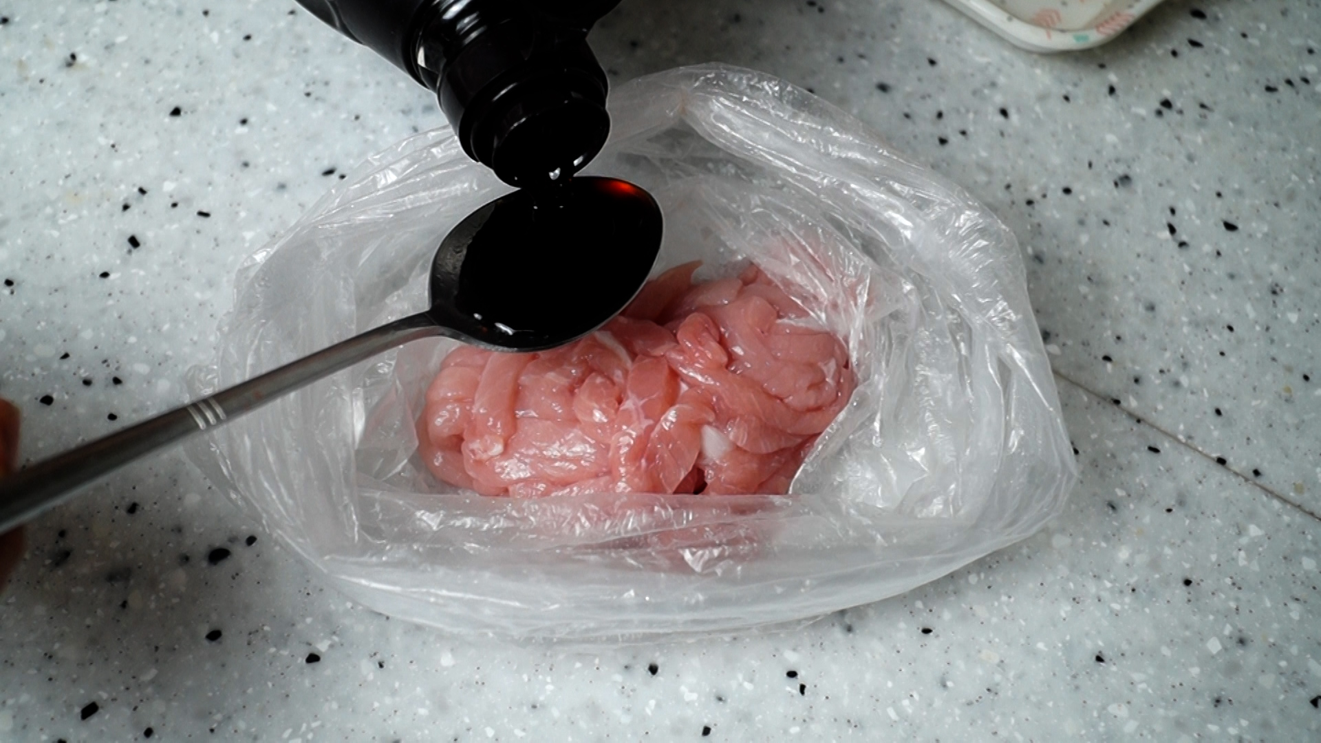 2. 돼지고기는 좀 얇은거 아무거나 준비해서 진간장 1스푼 8g 을 넣어주세요. 저는 잡채용 길쭉한 돼지고기를 사용했어요~