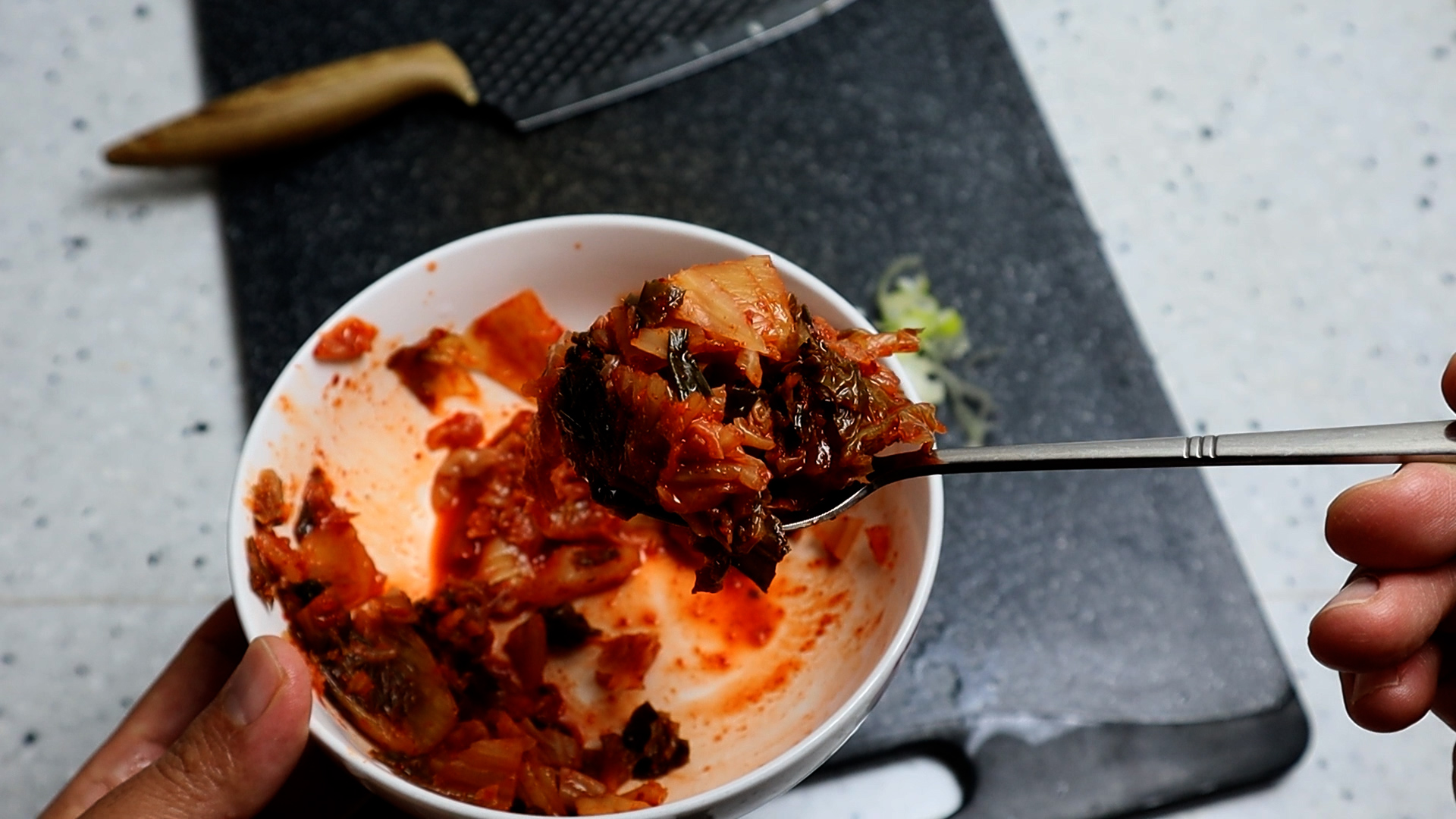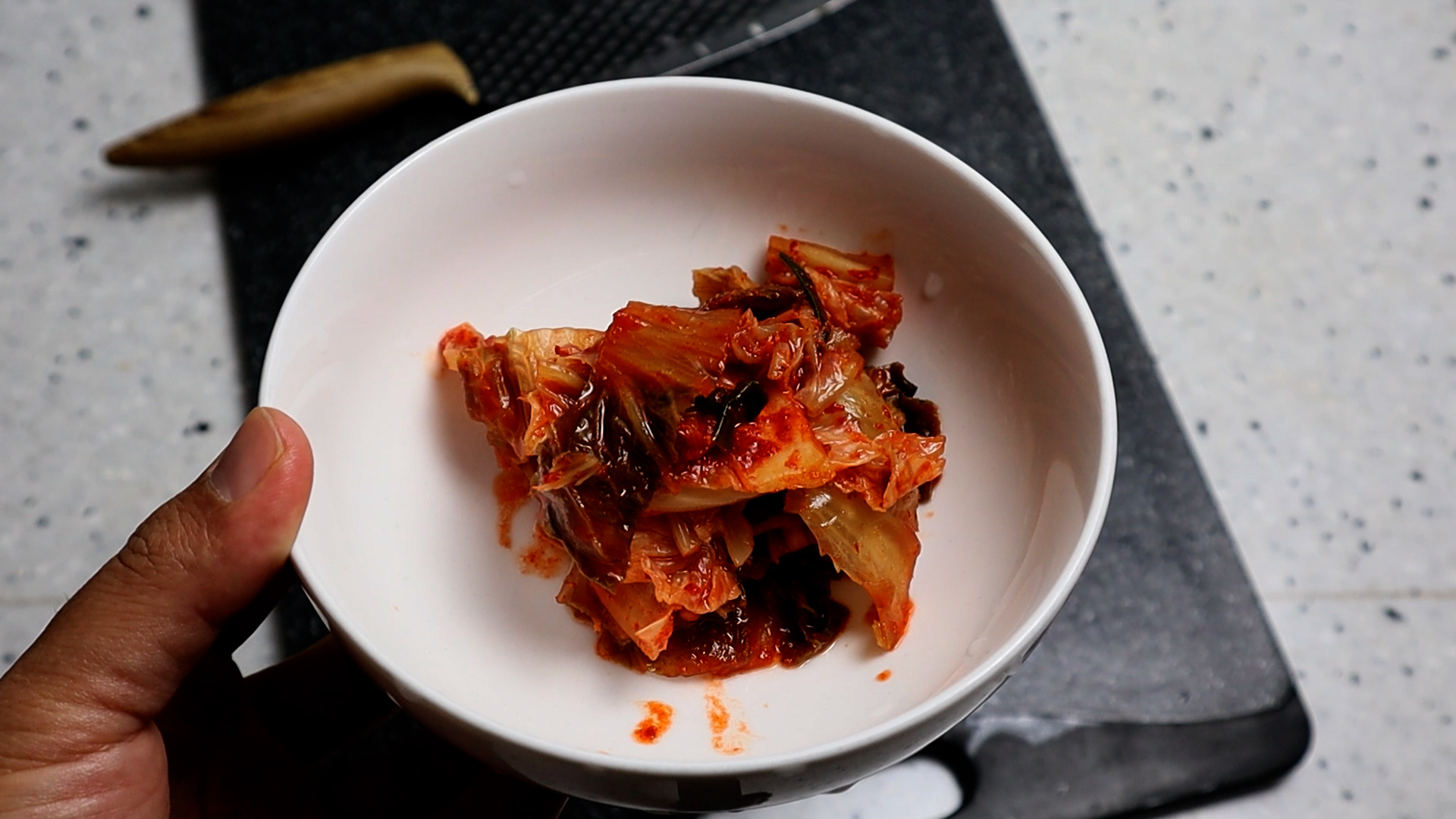4. 김치는 도마 버리면 설거지하기 귀찮으니까 그릇안에서 먹기 좋은 크기로 잘라주세요.