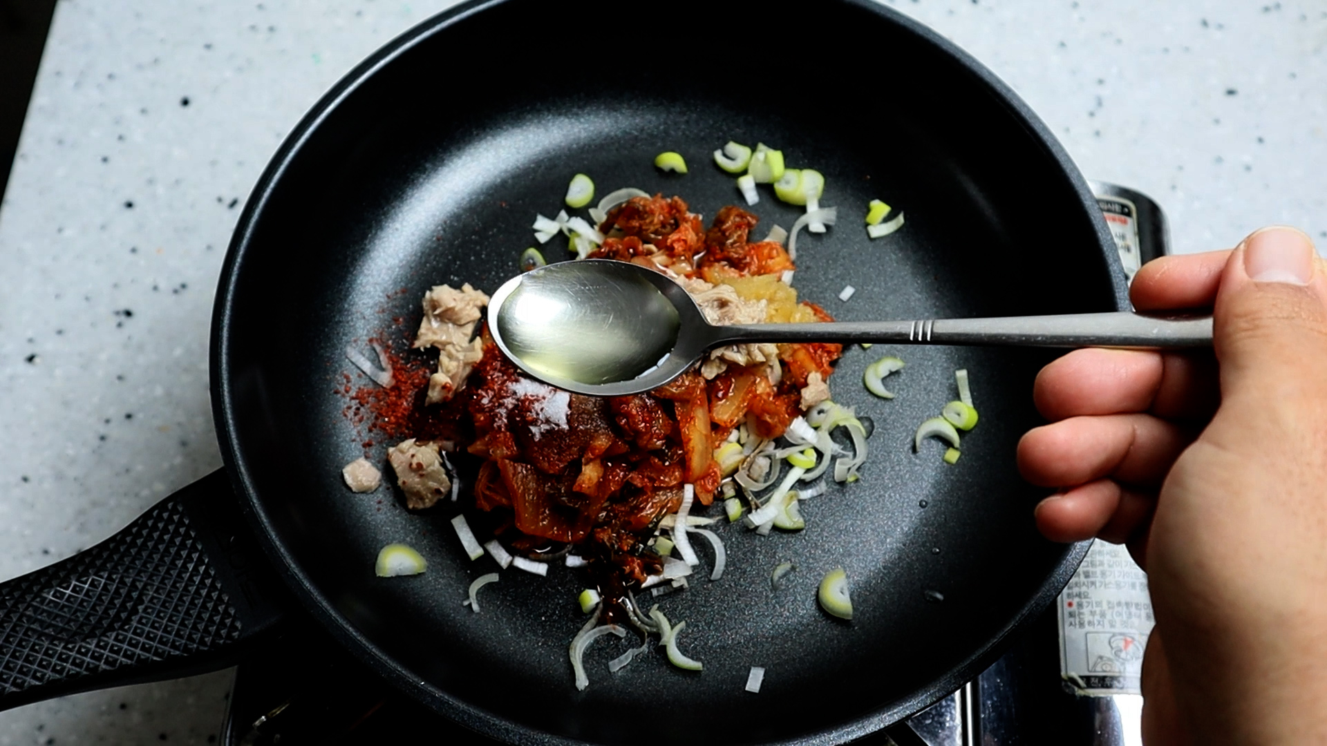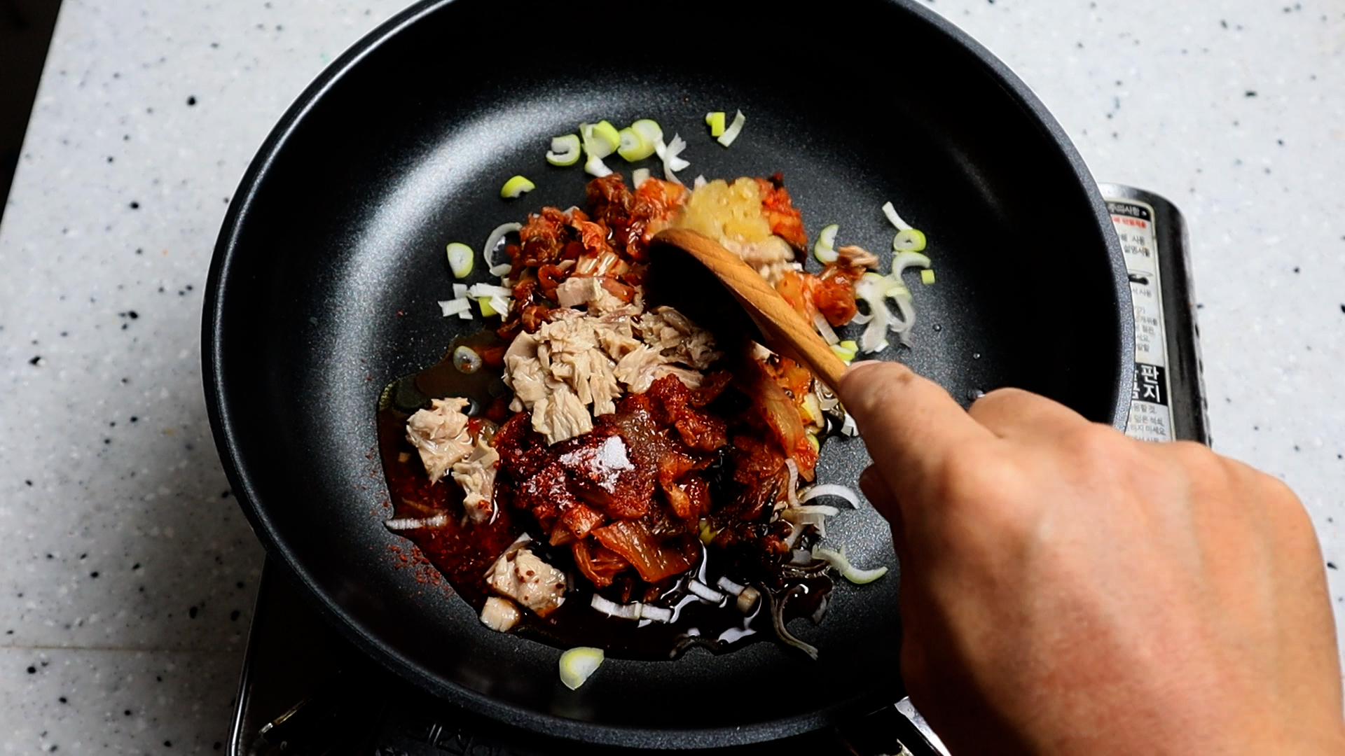 17. 불을 중약불로 올리고 팬이 열받아 재료가 자글거리기 전까지 참치를 으깨 가면서 재료를 골고루 섞어주세요.