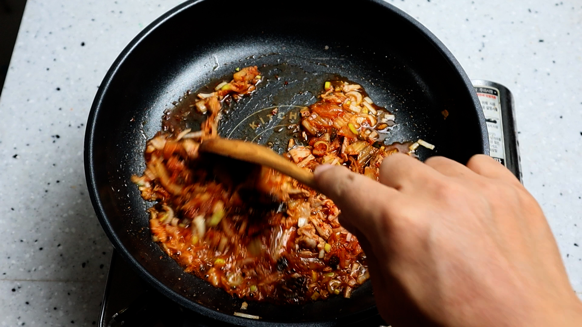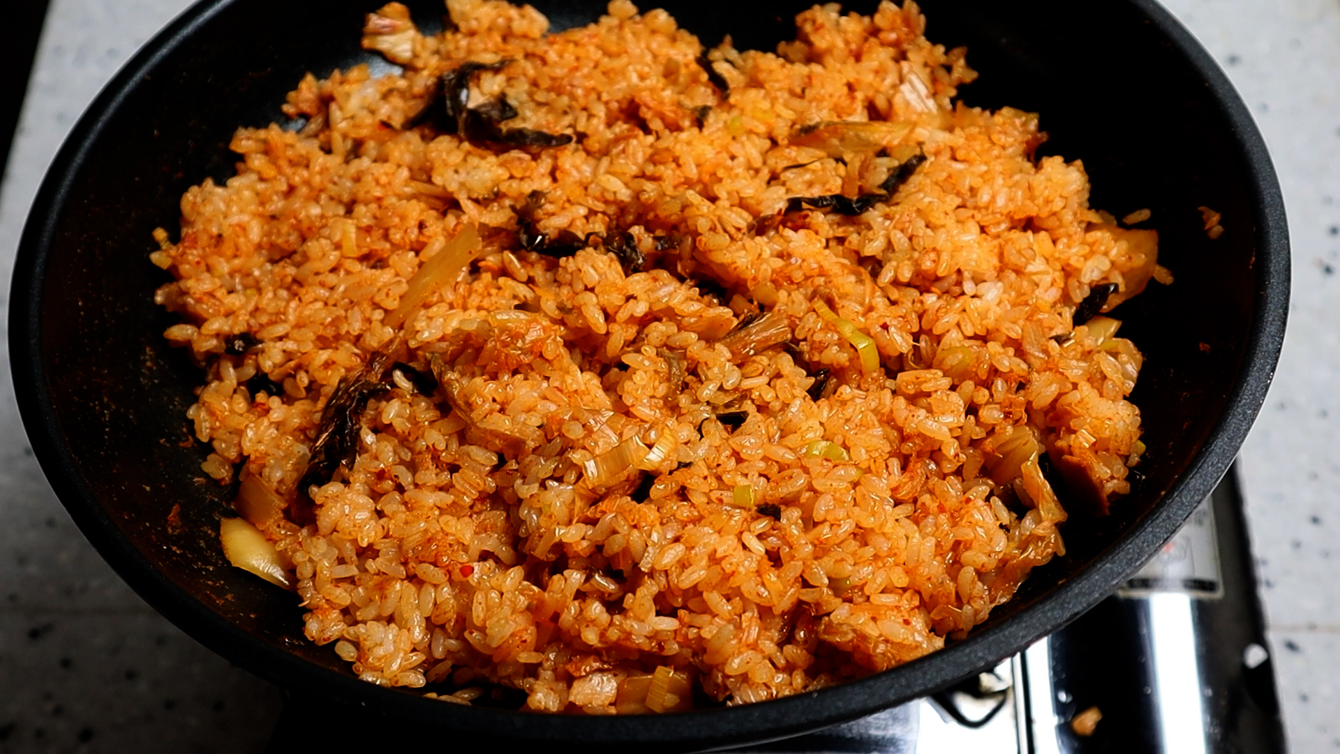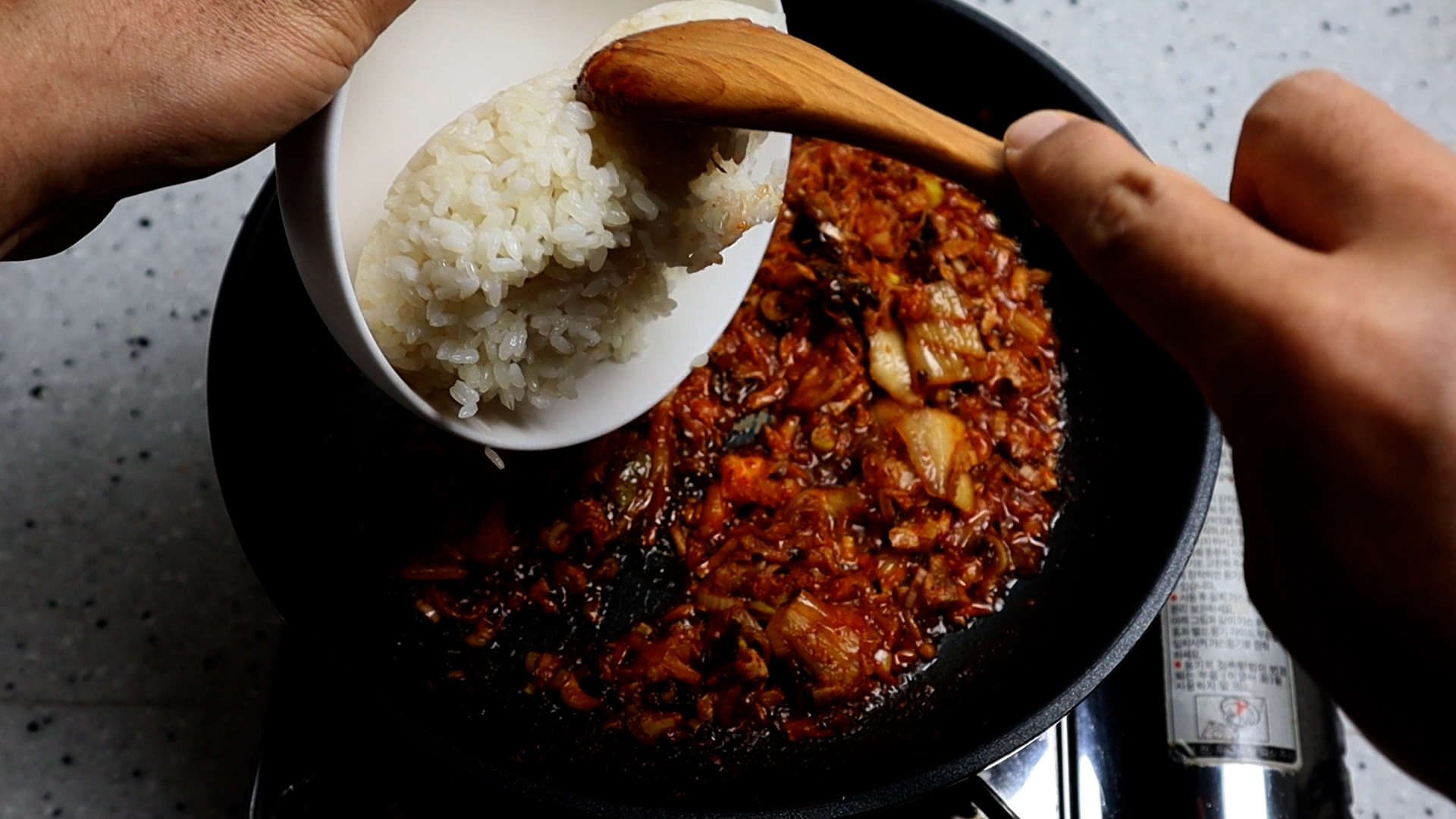 23. 그리고 밥알을 넓게넓게 펴서 20~30초를 가만히 놔두면서 밥알과 양념이 살짝살짝 늘러붙는 시간을 주세요!