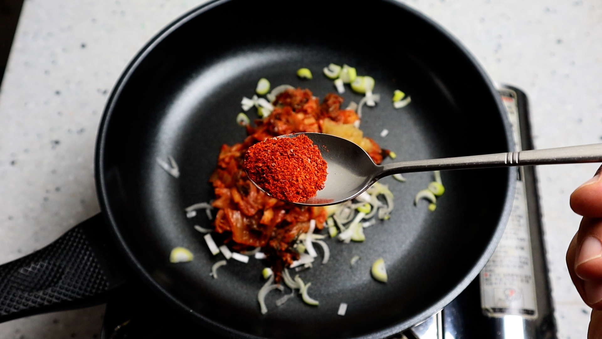 9. 고추가루 1/3스푼 2g 가능하면 중간입자 고추가루를 사용하세요~ 너무 굵은거 쓰면 입자가 거칠어 식감이 안좋아 질수도 있습니다.