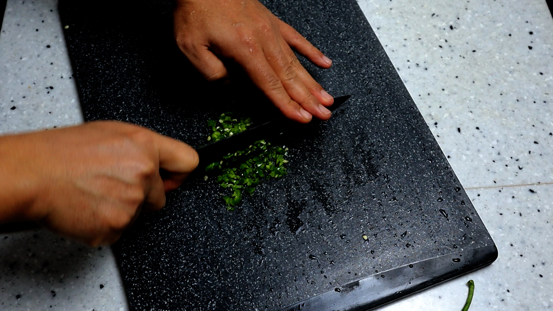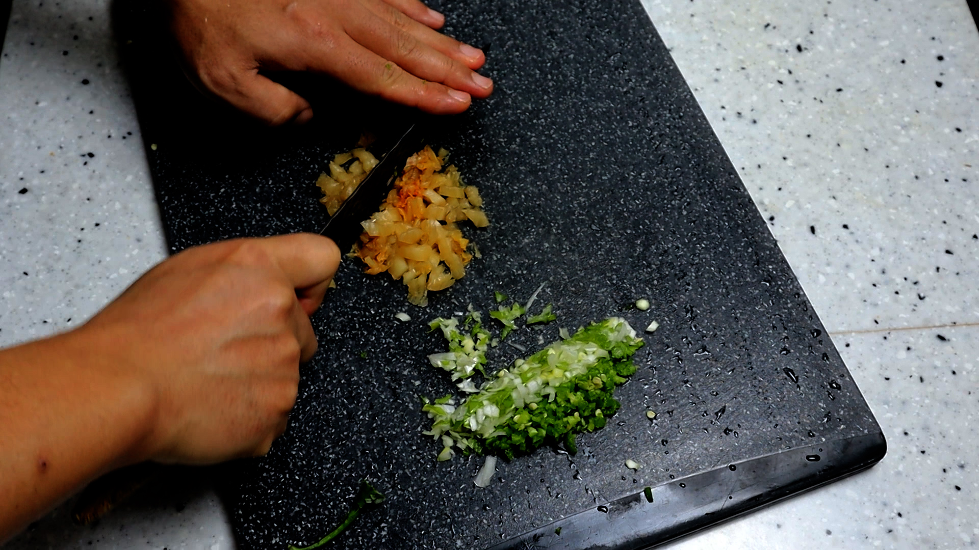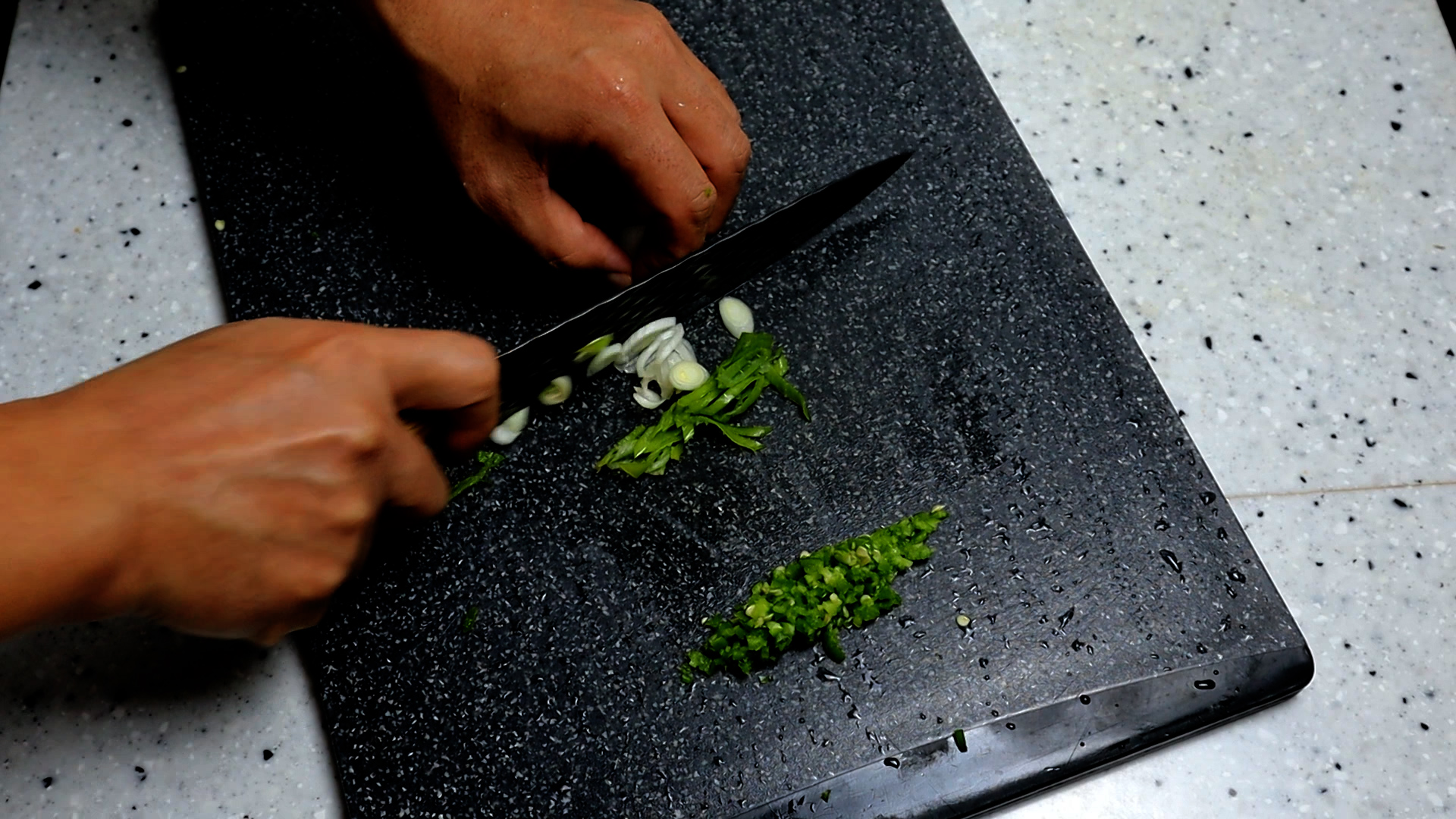 6. 대파 흰대 초록대 섞어서 20g 을 썰어준 다음에 고추 처럼 잘게 다져주세요. 다진 다음 크게 2큰술 분량 정도가 됩니다.
