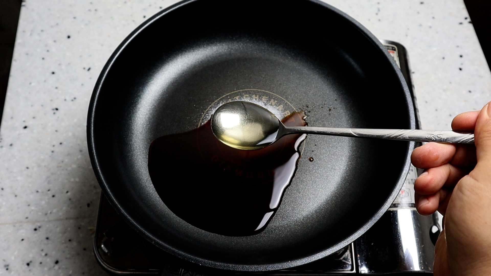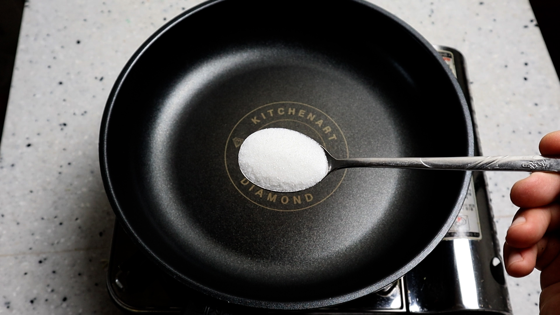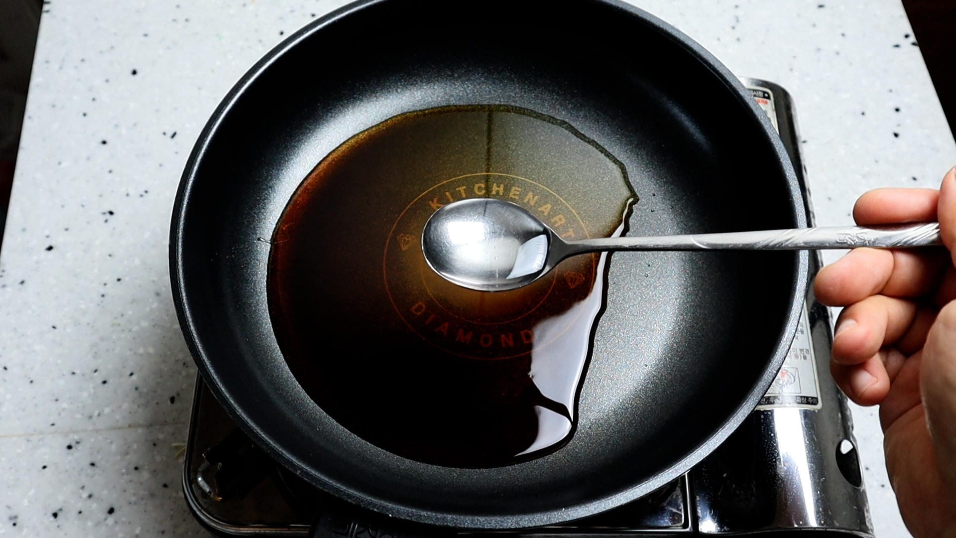 15. 그릇에 양념 만들면 설거지 거리만 늘어나니 후라이팬 준비해서 설탕 2스푼 20g!