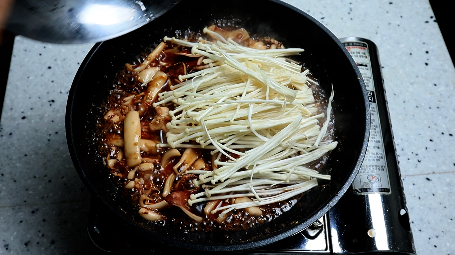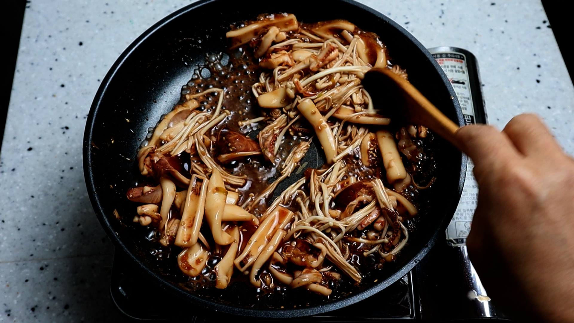 30. 팽이버섯을 넣어주세요. 양념이 진득해 지지 않았는데 팽이버섯을 넣으면 팽이버섯 수분때문에 양념이 흥건해져서 오징어에 양념이 안베어 들뿐 아니라 양념 졸이다가 버섯이 완전히 쪼그라들수도 있으니 꼭! 오징어와 양념을 진득하게 볶은 다음 넣어주세요.