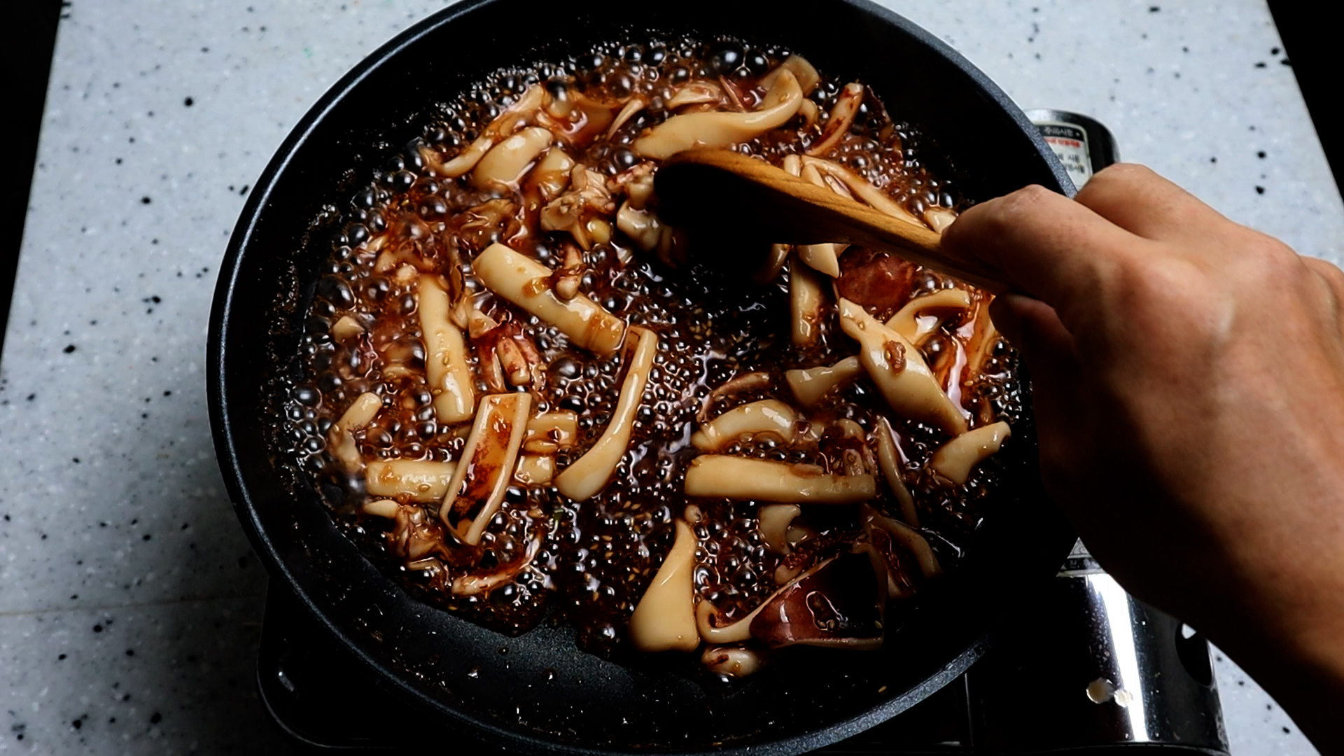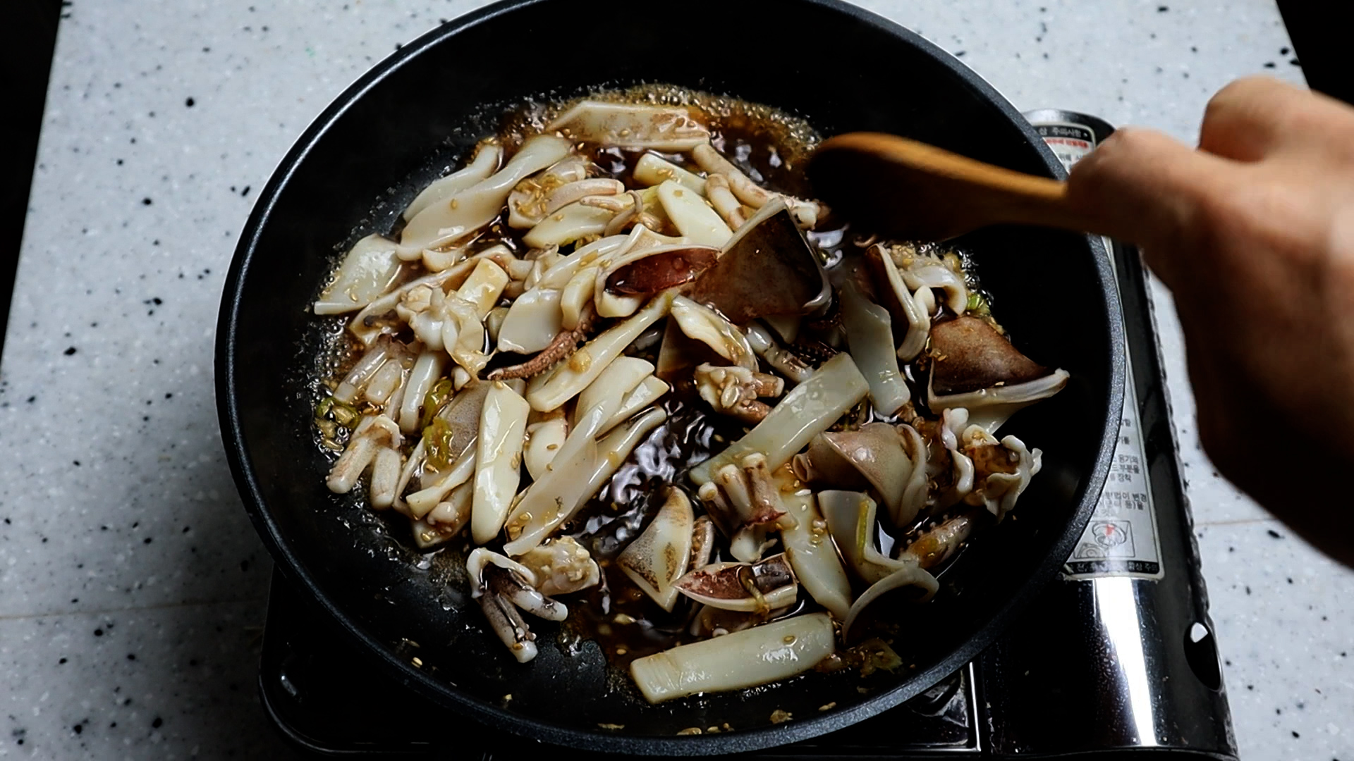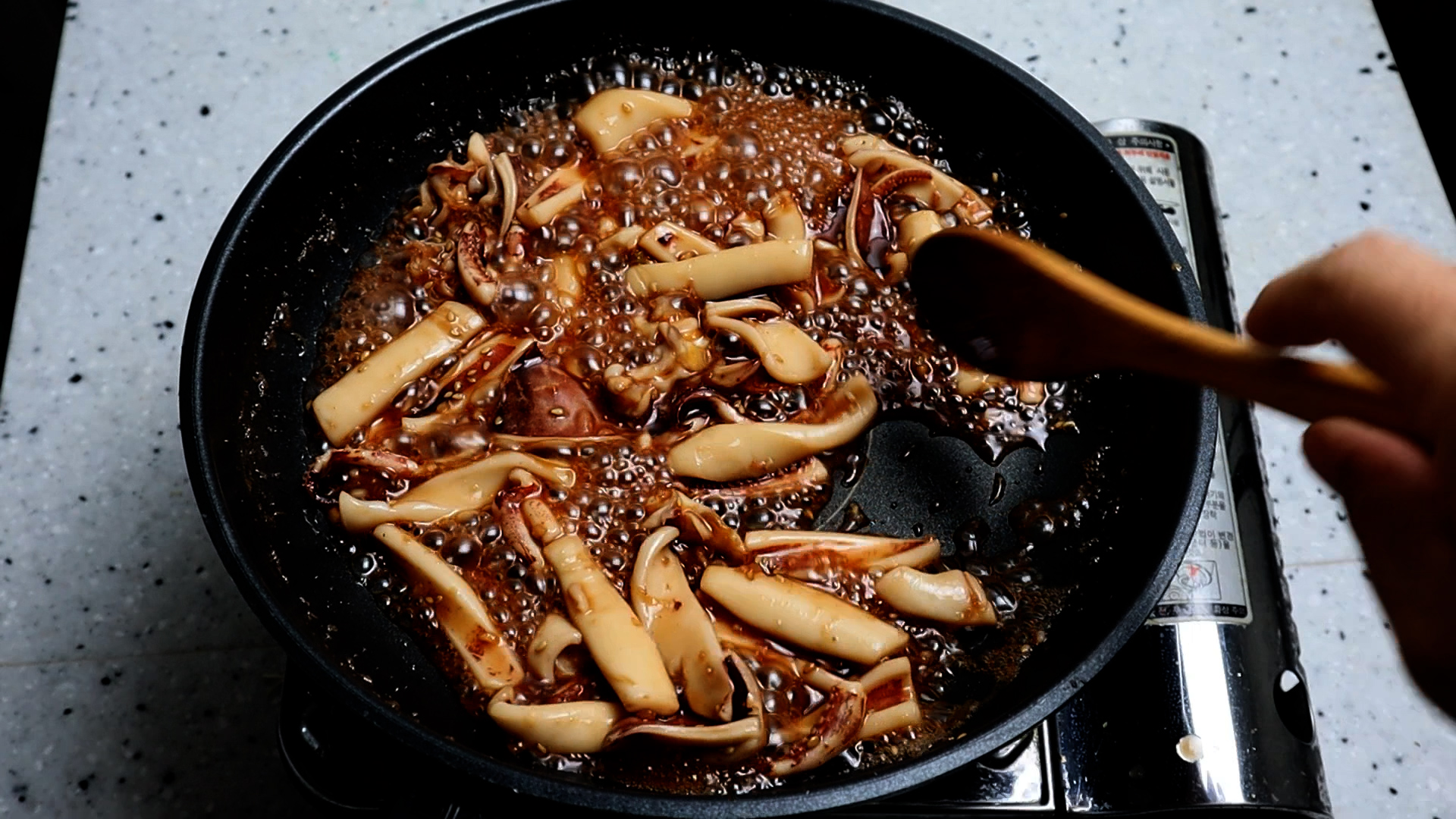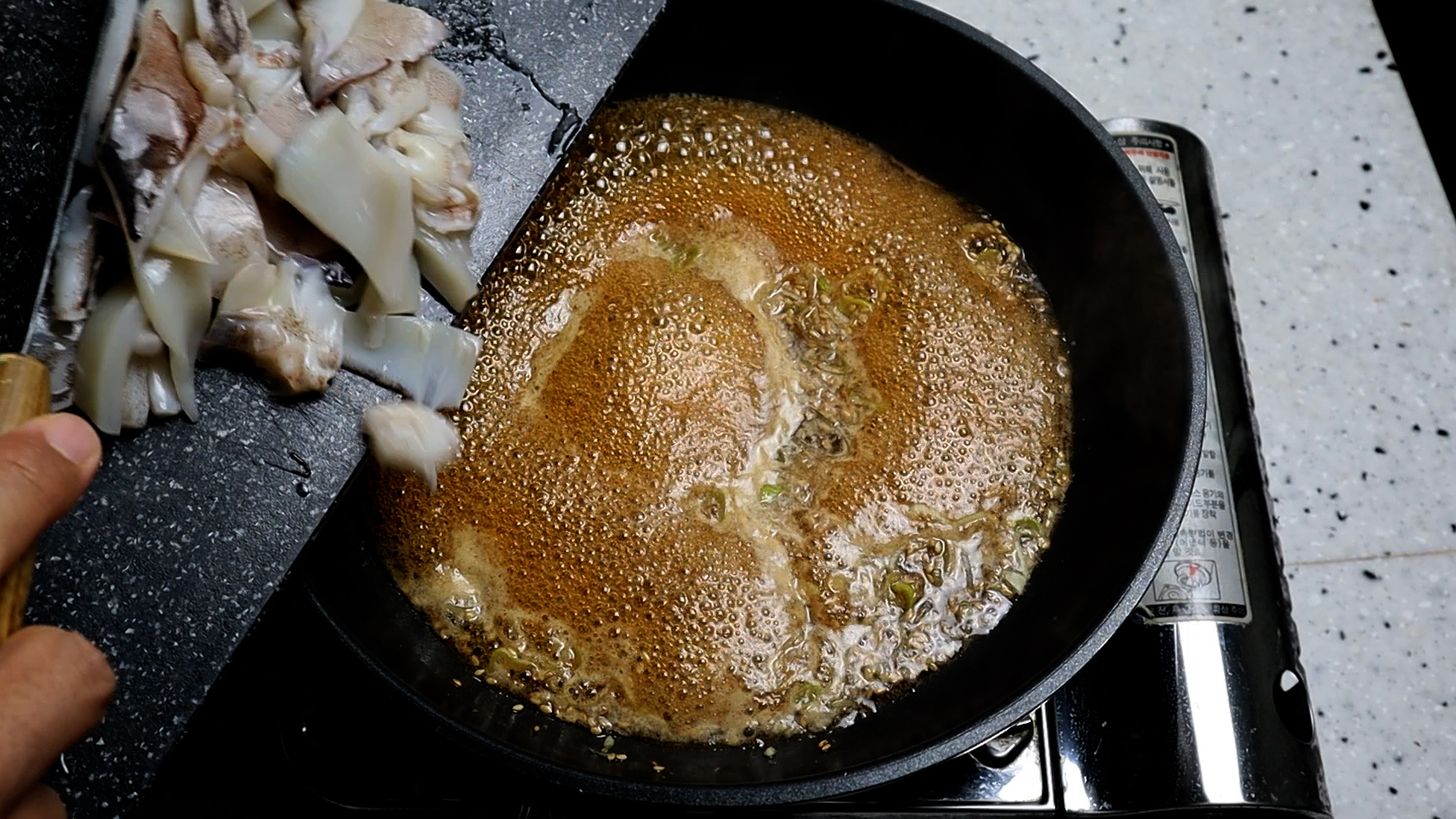 25. 불을 강불로 올리고 적당히 섞어주다가 양념이 끓어 오르면 오징어를 넣어주세요.