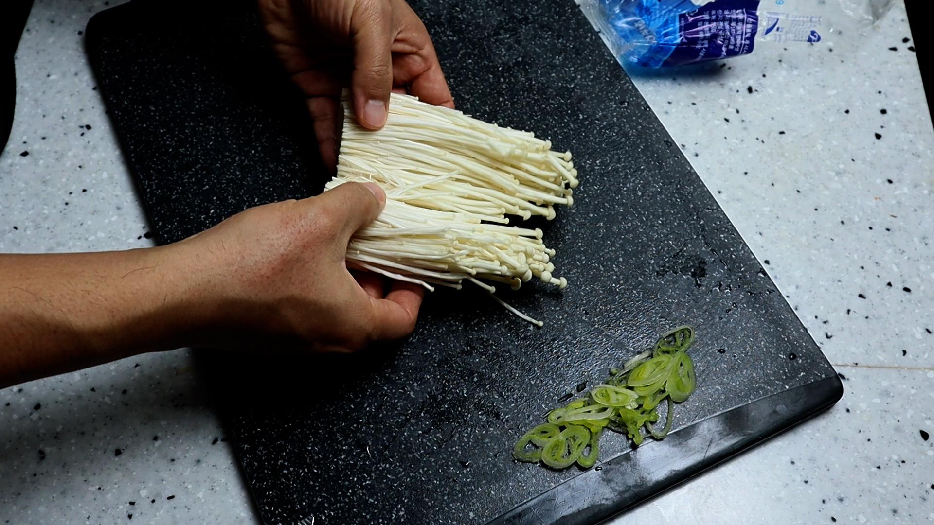 2. 팽이버섯을 봉지 채로 써는 경우가 있는데 그러면 위생도 문제고 속이 안보여 밑둥이 과도하게 잘려 나갈수 있으니 봉지를 벗겨서 이렇게 재배통에 끼여 있던 부분을 확인해주시고