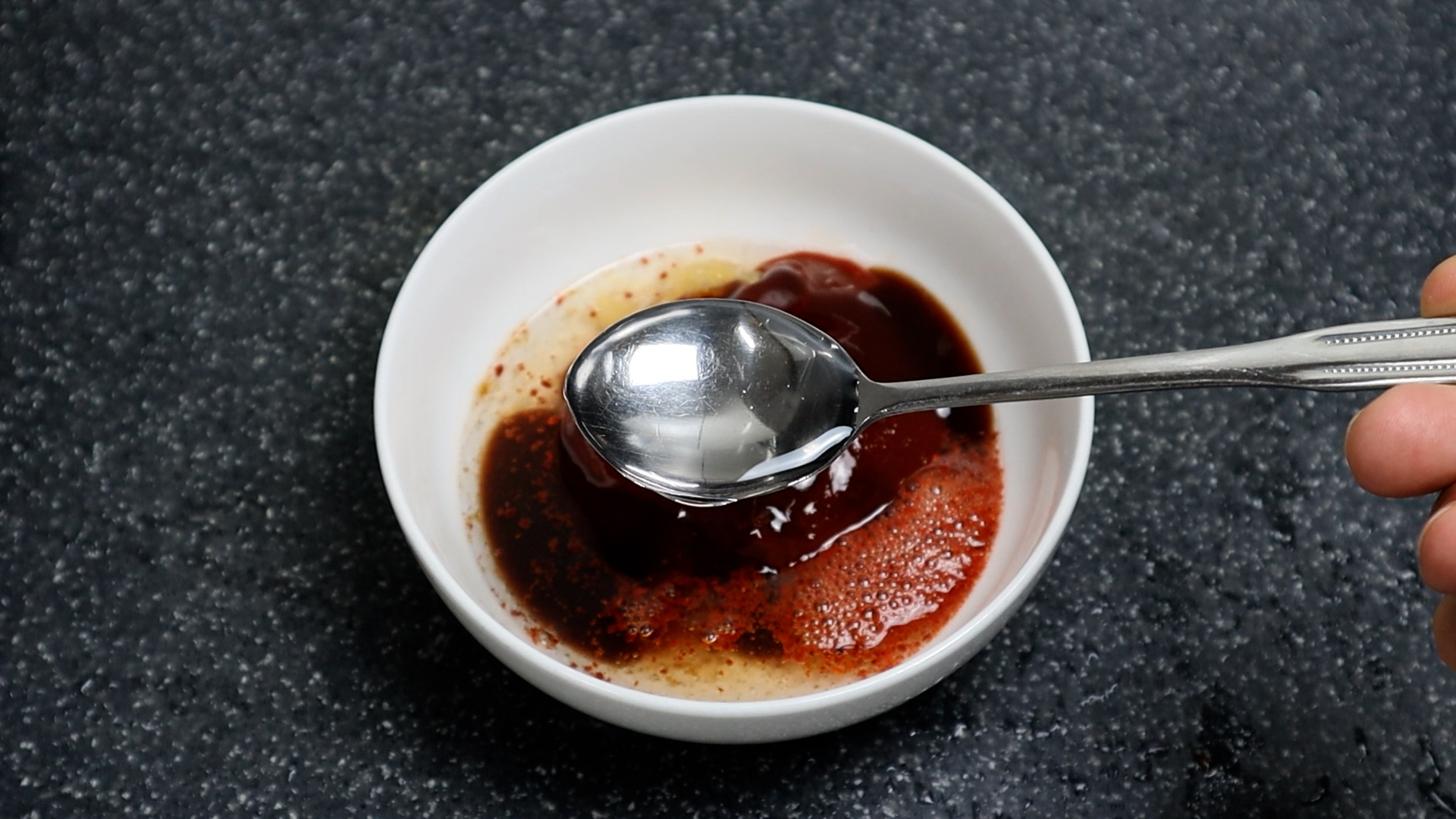 1. 맛있는 양념장 부터 만들어요! 고추가루를 최대한 고운걸로 1스푼 7g 을 넣어주세요. 고추가루가 너무 굵으면 믹서기에 적당히 갈아서 사용하시는것도 좋아요~