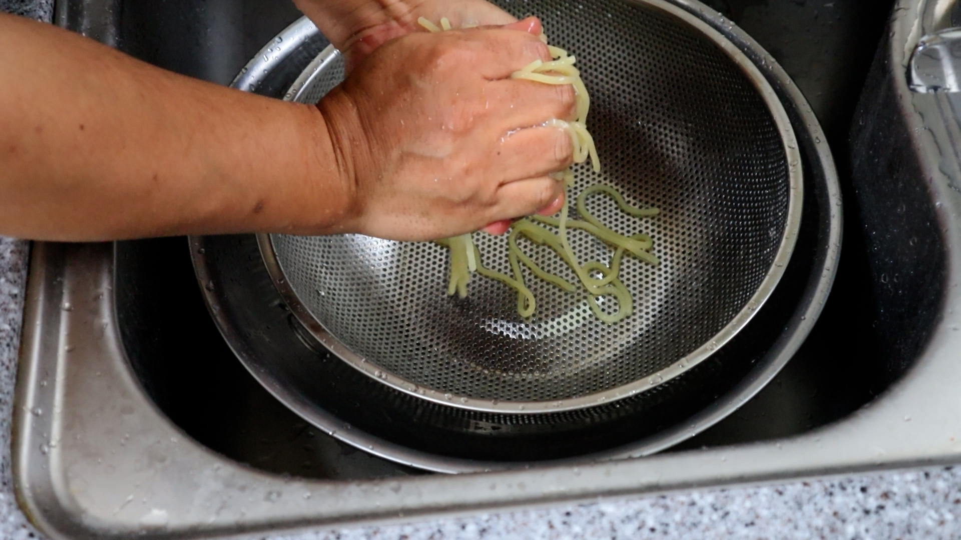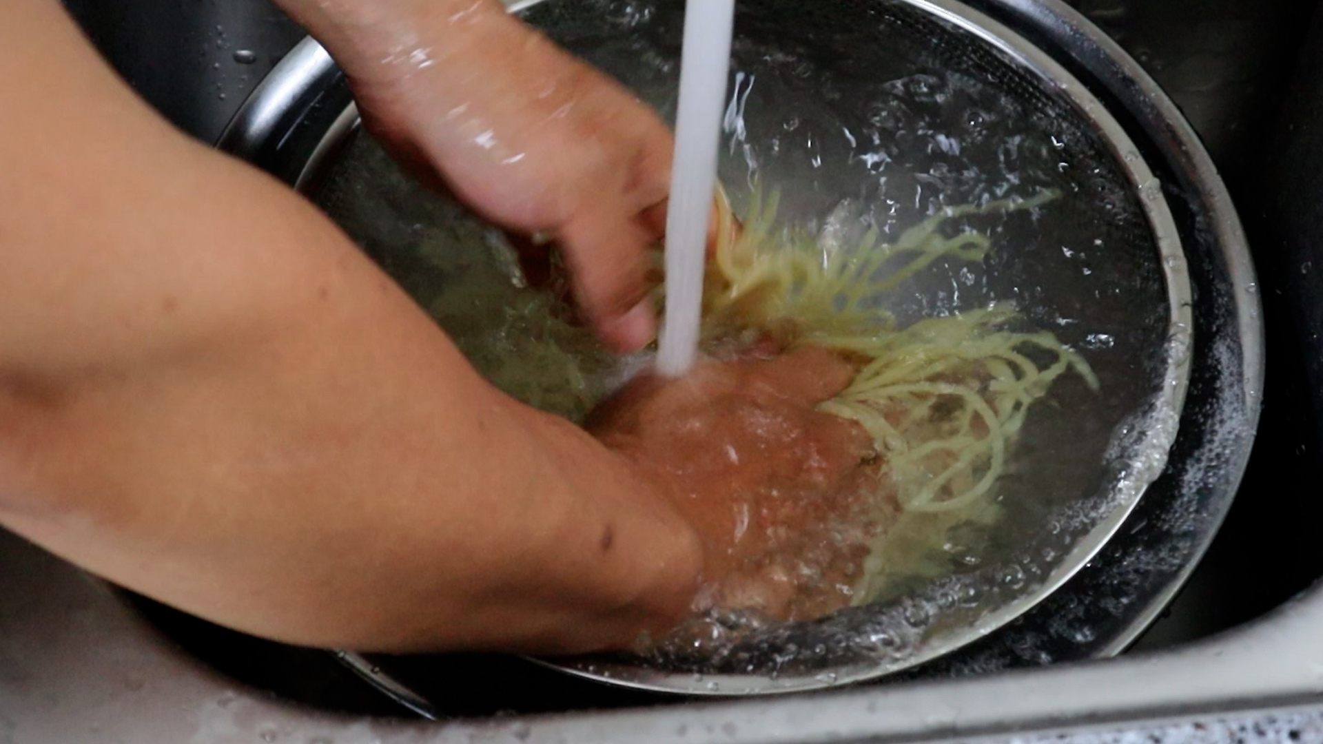18. 삶은 쫄면을 찬물에 박박 문질러 2~3차례 씻어서 표면에 전분기를 제거해주시고