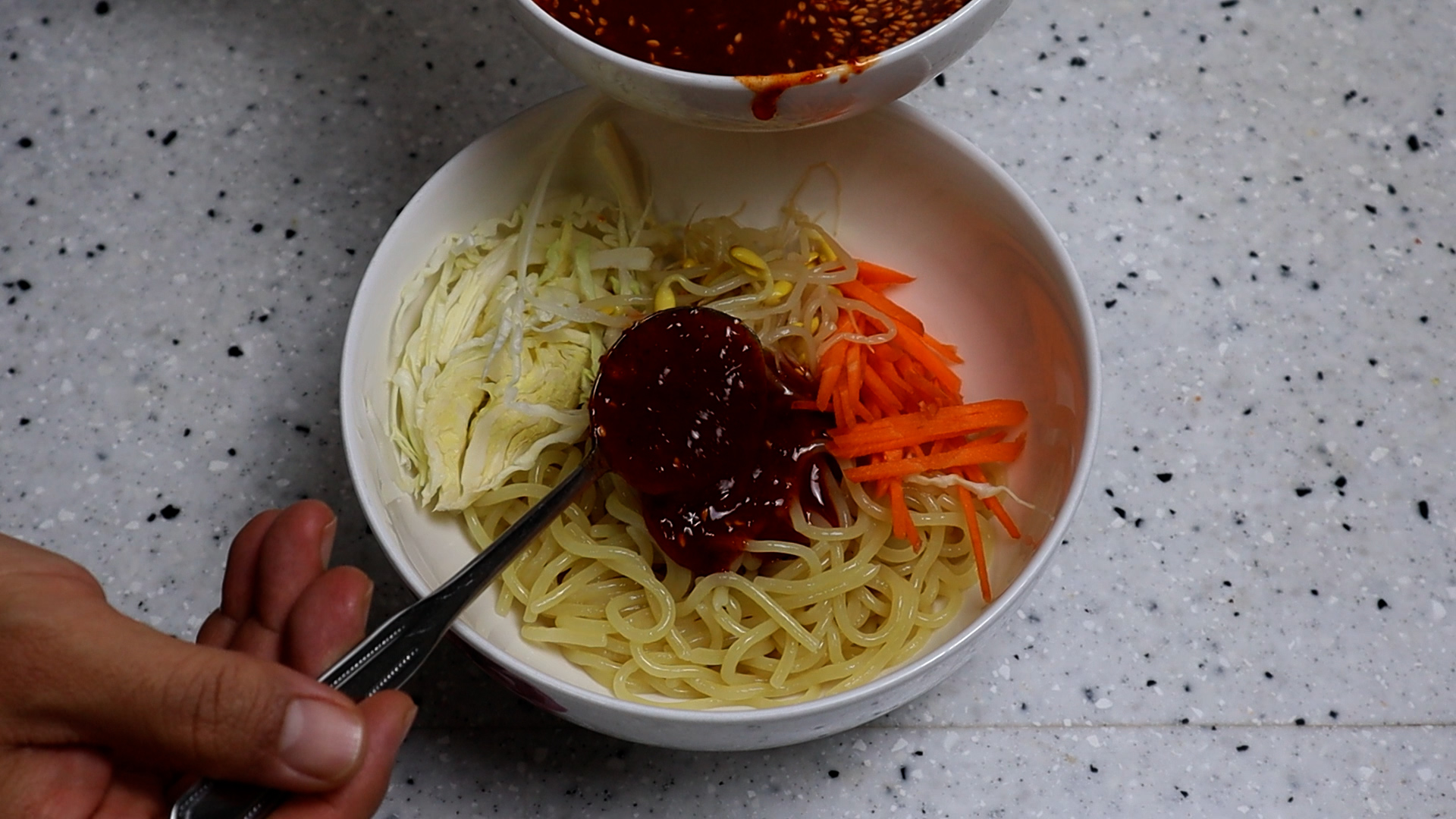 20. 물기 뺀 쫄면 그릇에 담고 야채 기호에 맞게 올려서 양념장을 6~7스푼씩 뿌려주세요