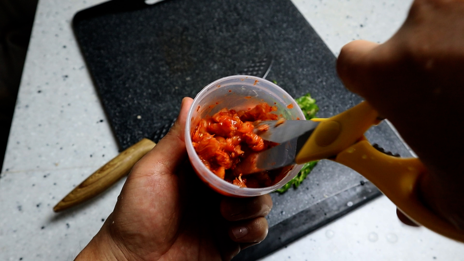 8. 김치를 잘게 잘라주는데 도마에서 썰면 설거지 하기가 힘들테니~ 소량 조리할땐 이렇게 컵에 넣고 잘게 잘라주시면 좋습니다.