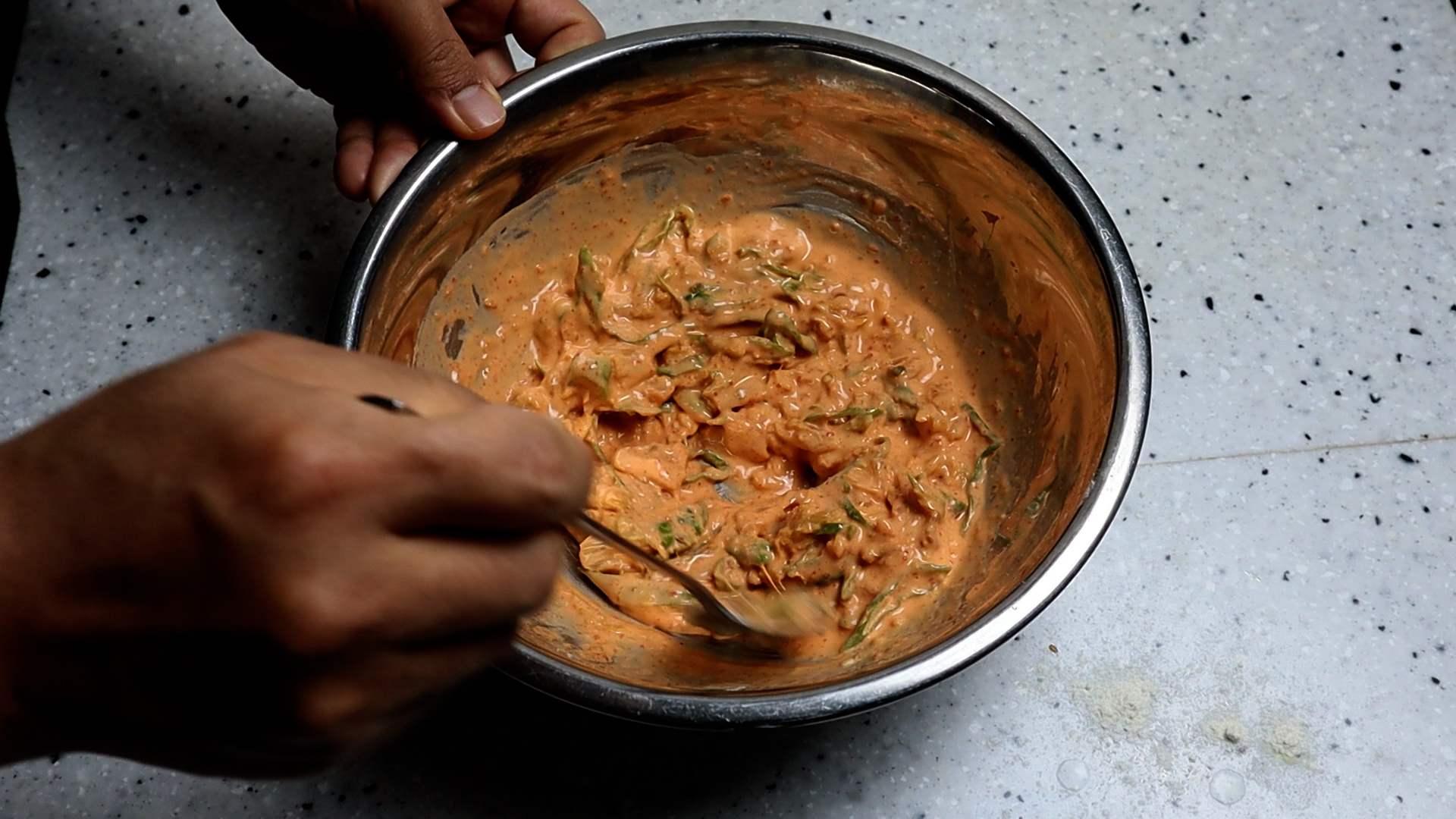 14. 재료를 섞은 다음 반죽 부분만 숟가락에 퍼서 기울여 보면 묽은 소스 처럼 뚝뚝뚝뚝 떨어지는게 아니라 요플레 같은 느낌으로 꾸덕하게 떨어질 정도의 점도가 나와야 반죽이 적당한거에요