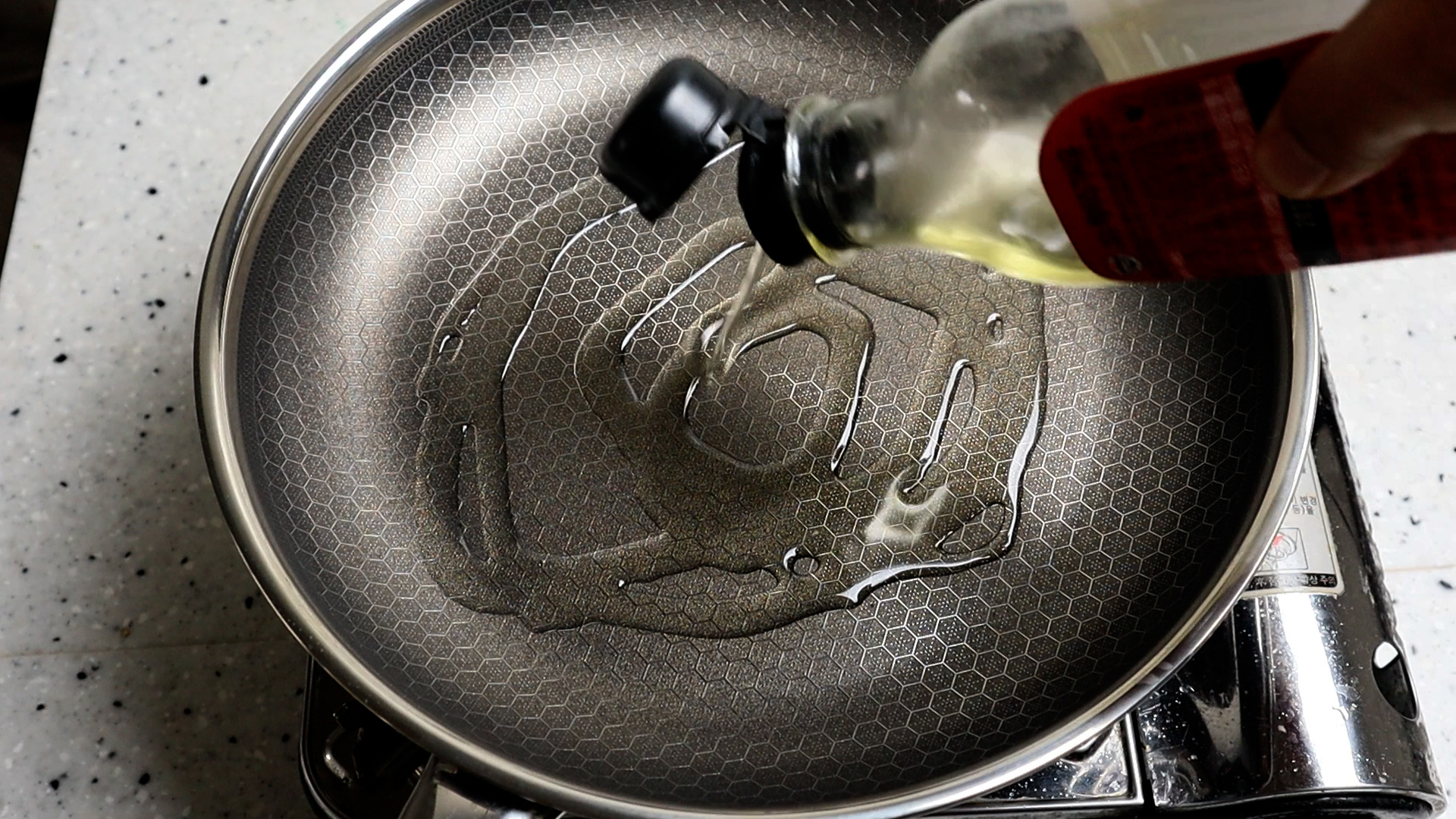 16. 팬에 식용유를 5~6스푼 듬뿍 뿌려준 다음 중불로 달궈 주세요. 전 1장 부치는데 대략 이정도 식용유가 들어가야 전이 맛있게 구워집니다.