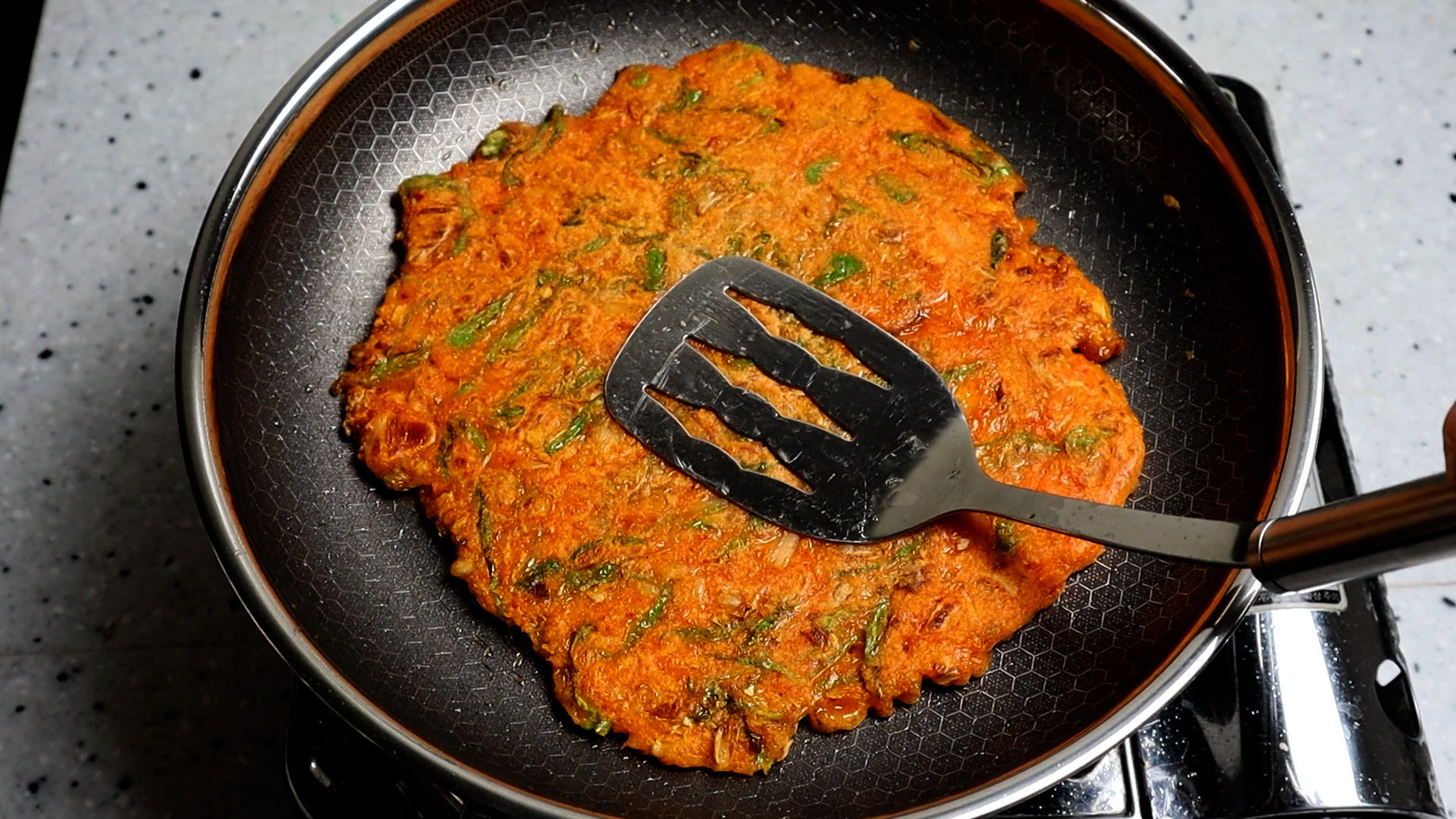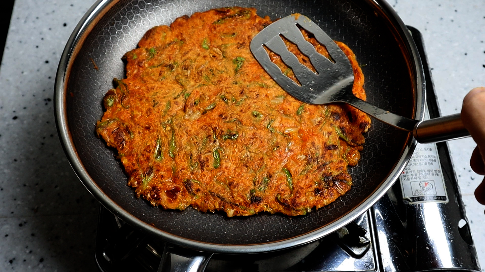 17. 달군 기름에 반죽을 부어주세요. 이 레시피는 대략 20~22cm 전 1장 정도를 부칠수 있는 양입니다.