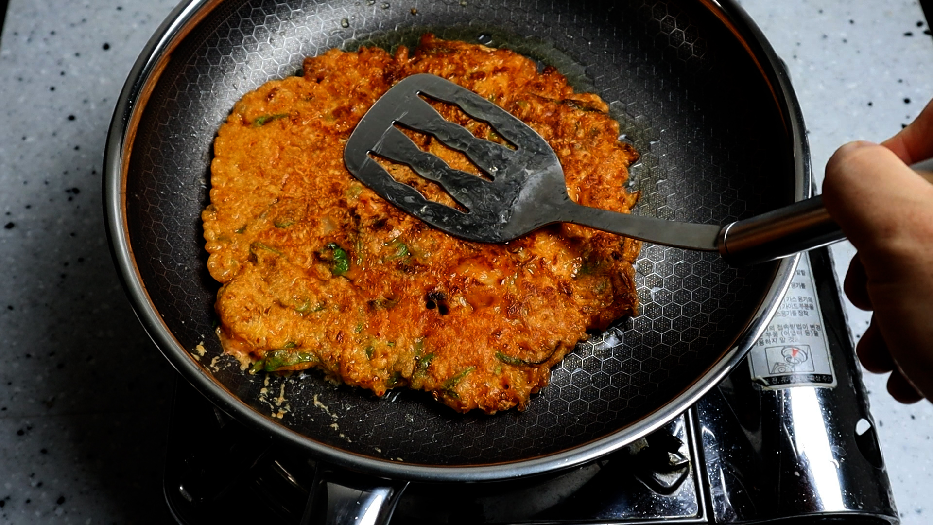 19. 골고루 펴서 1분 30초를 구워준 다음 뒤집어서 꾹꾹 눌러가면서 1분 정도를 구워주세요.