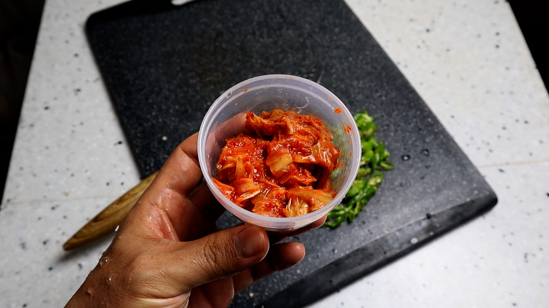 7. 적당히 익은 김치 100g 200cc 컵에 70% 정도 채워서 준비해주세요.