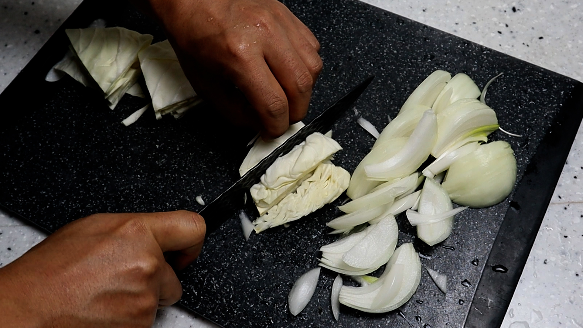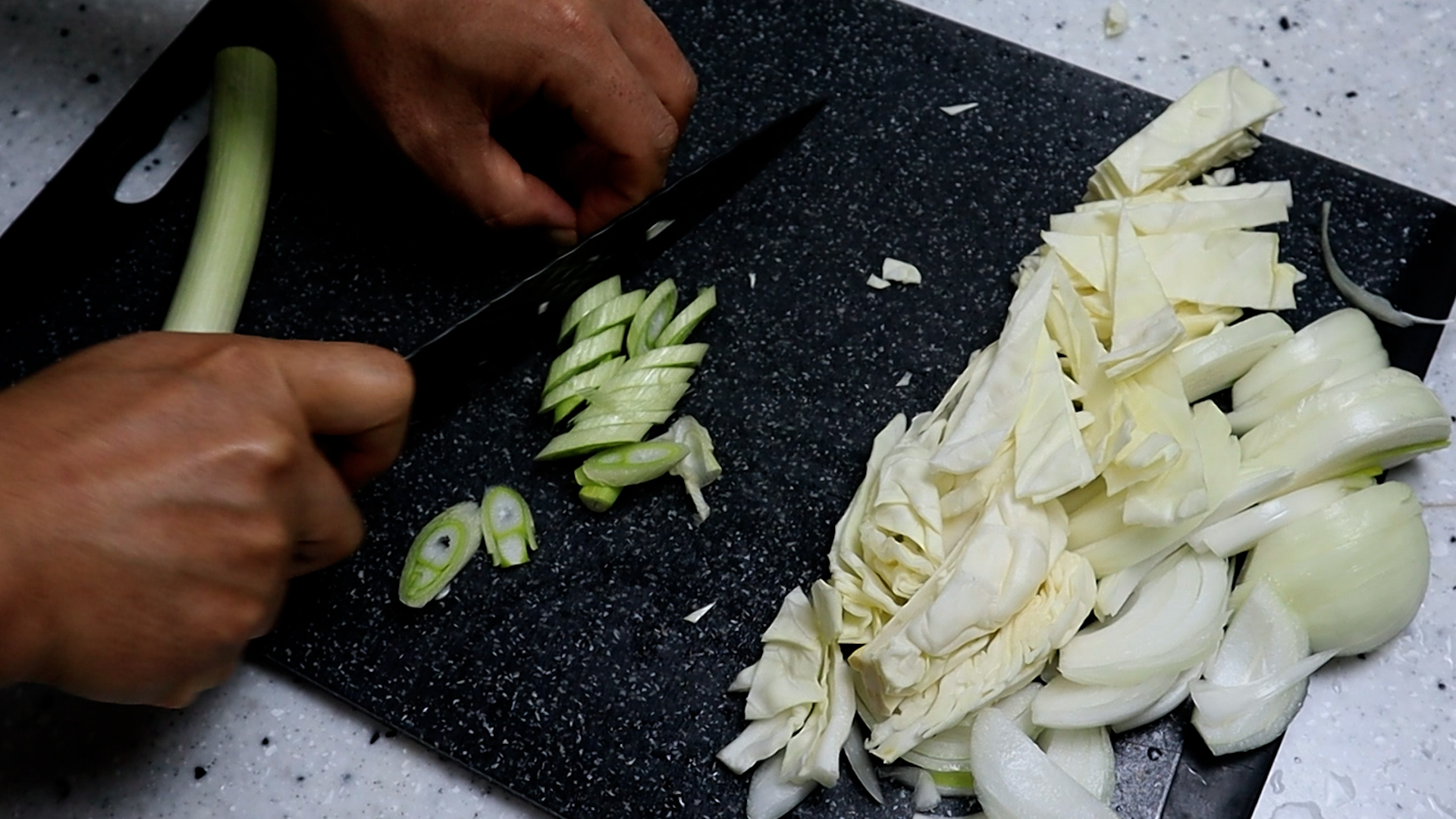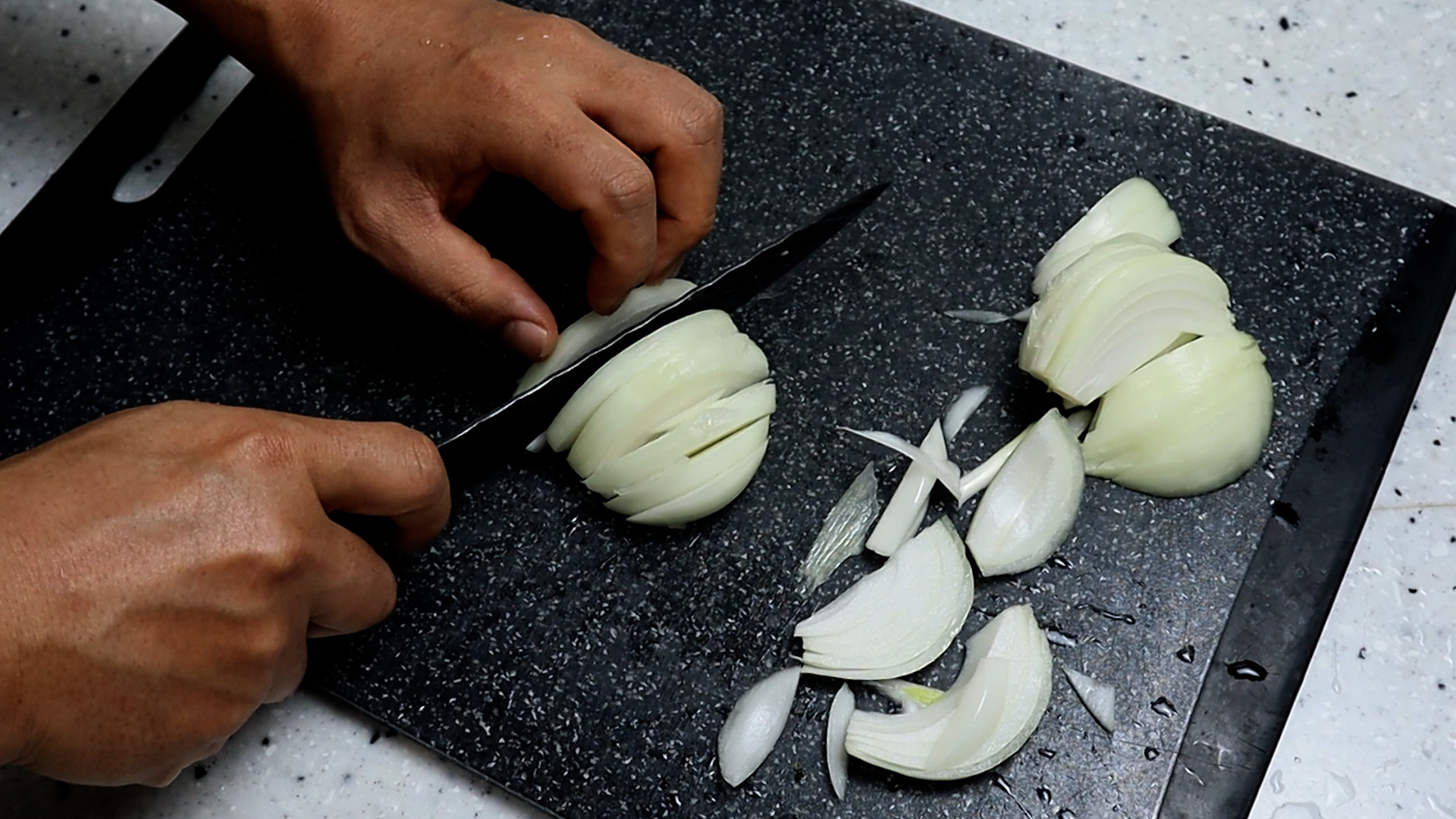 7. 양파중간거 1개를 대략 1cm 정도 두께가 나오게 채를 썰어주세요.