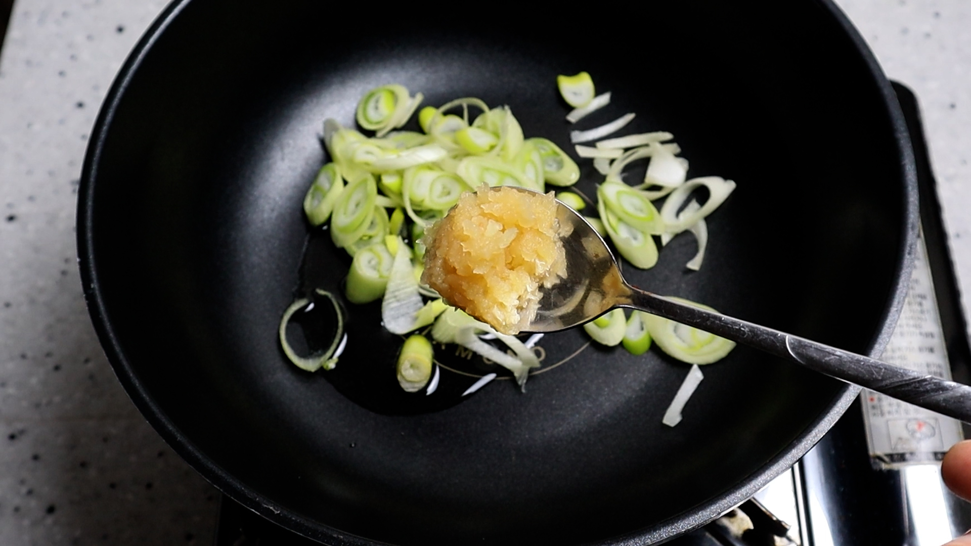 17. 대파를 전부 넣고 다진마늘 반스푼 10g 을 넣어주시고 불을 약불로 올려주세요