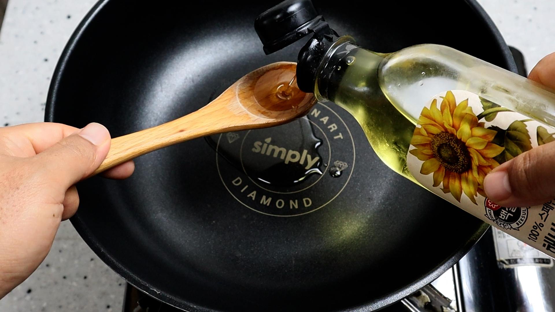 16. 웍에 식용유 4스푼을 부어주세요.