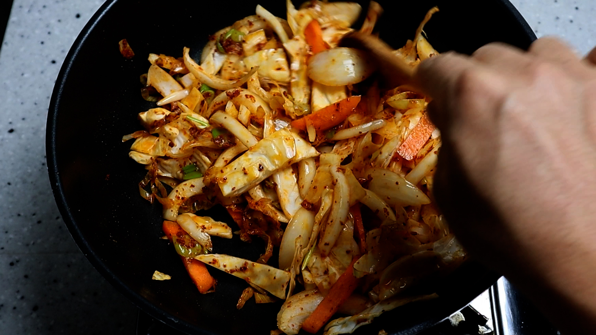 20. 호박을 제외한 야채를 전부 넣고 불을 강불로 올리고 1분 30초 정도를 볶아주세요