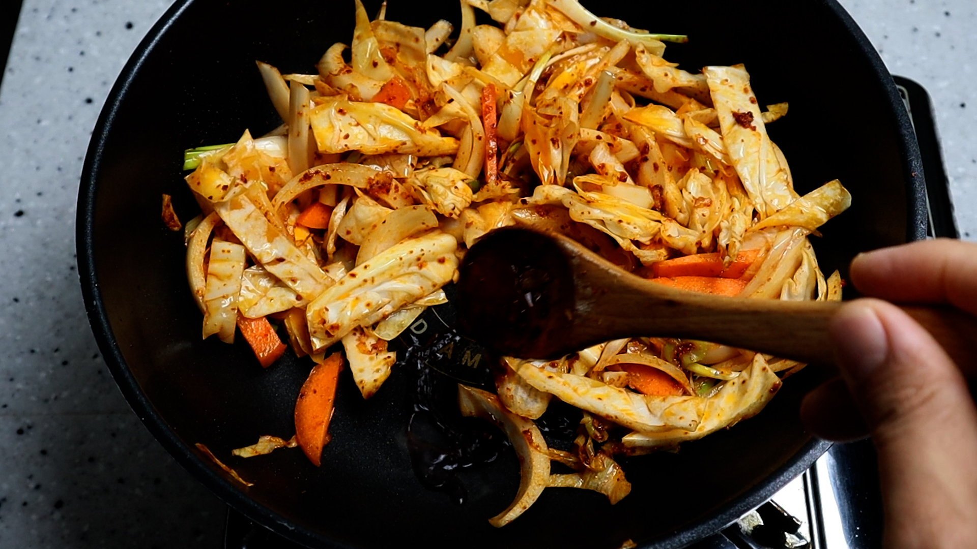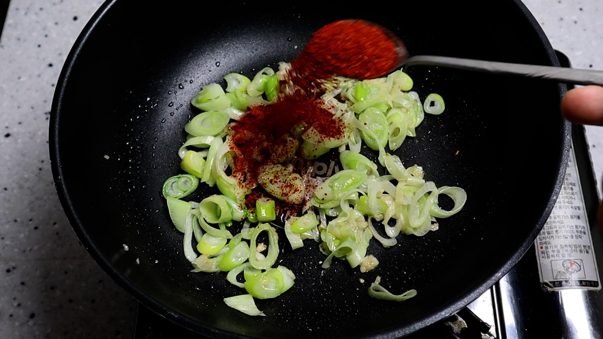 19. 고춧가루 1스푼 7g 을 넣고 약불 유지한채로 고추가루가 타지 않게 1분 정도를 볶아주세요.