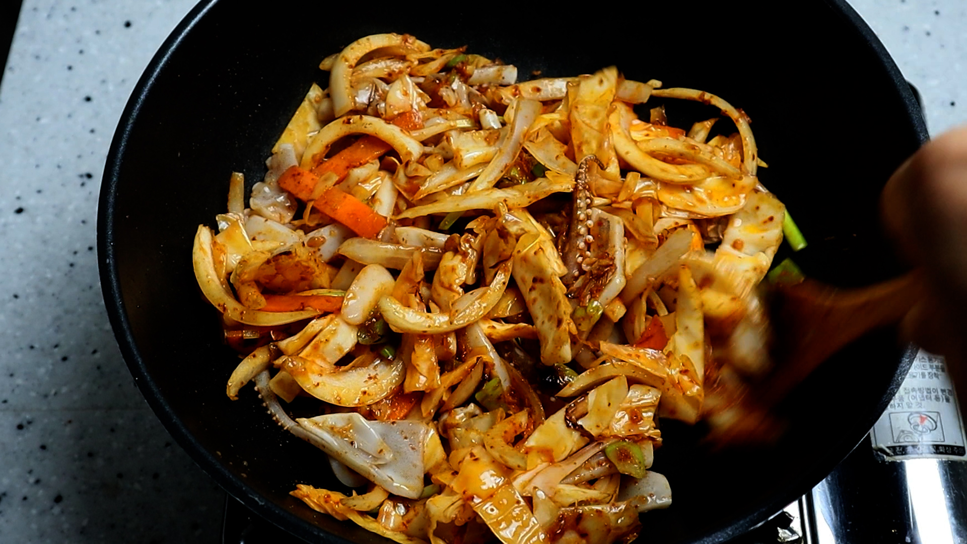 24. 양념장을 넣고 강불 유지하고 1분을 또 볶아주세요.