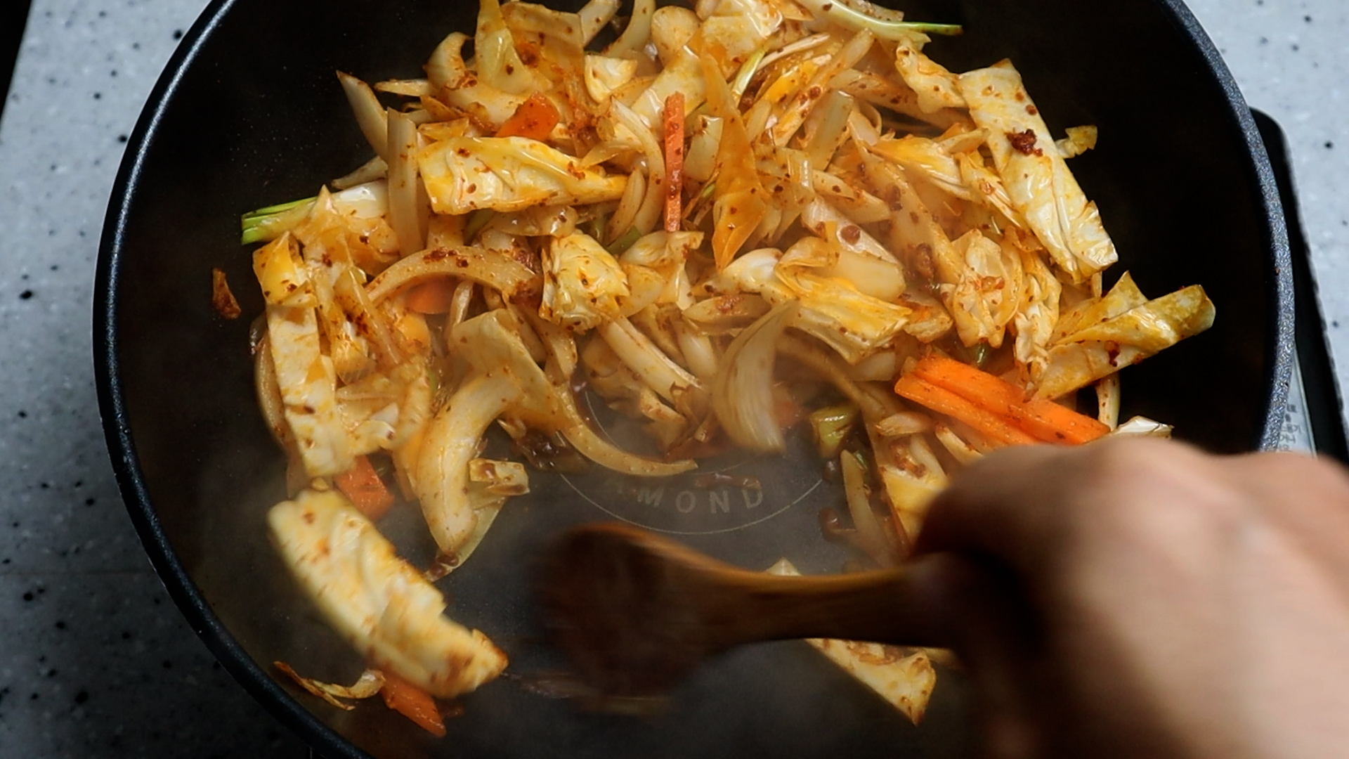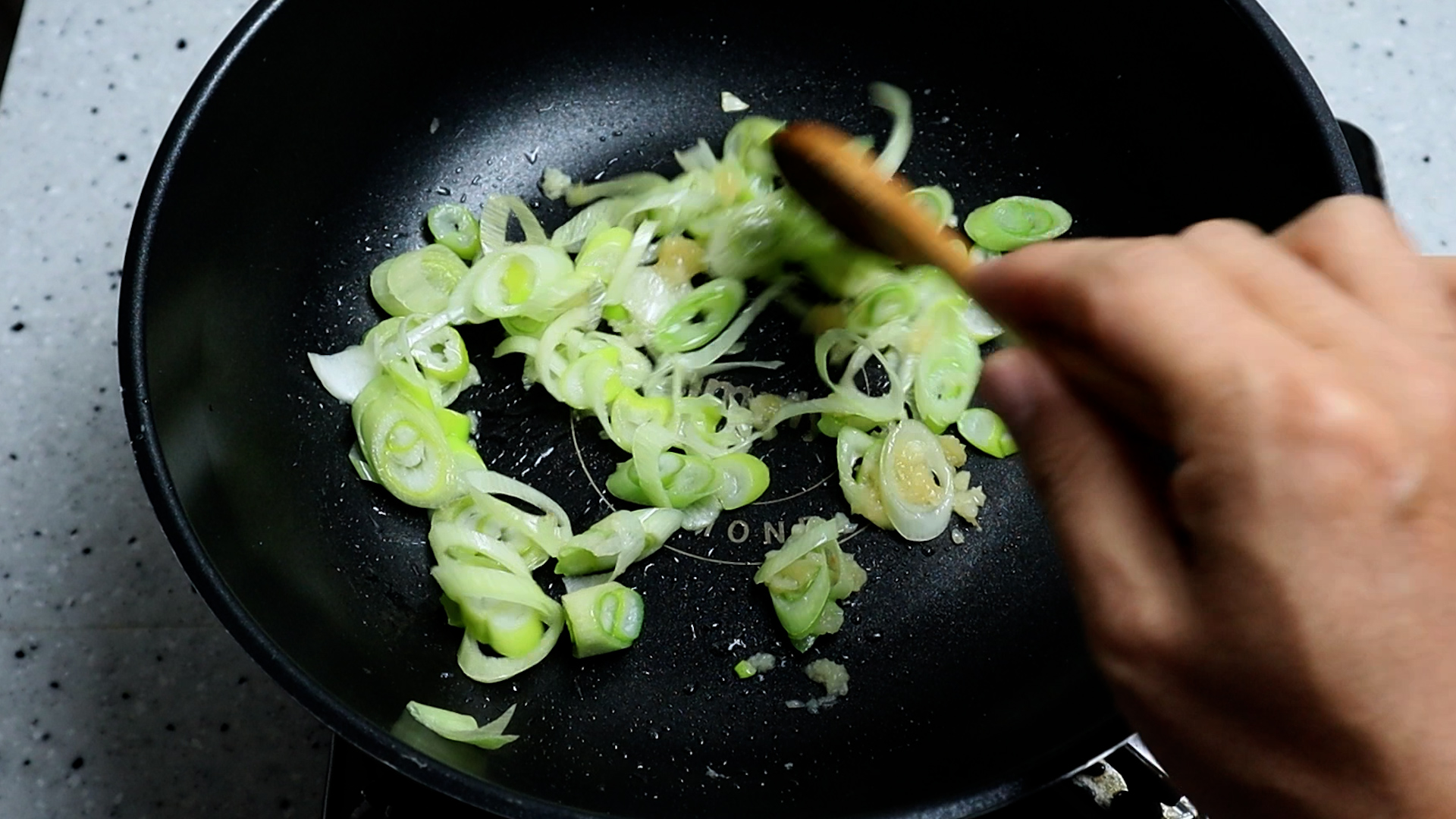 18. 기름에 재료가 자글거리는 소리가 들리기 시작하면 중간에 한번씩 섞어주면서 1분 30초 정도를 볶아주세요.