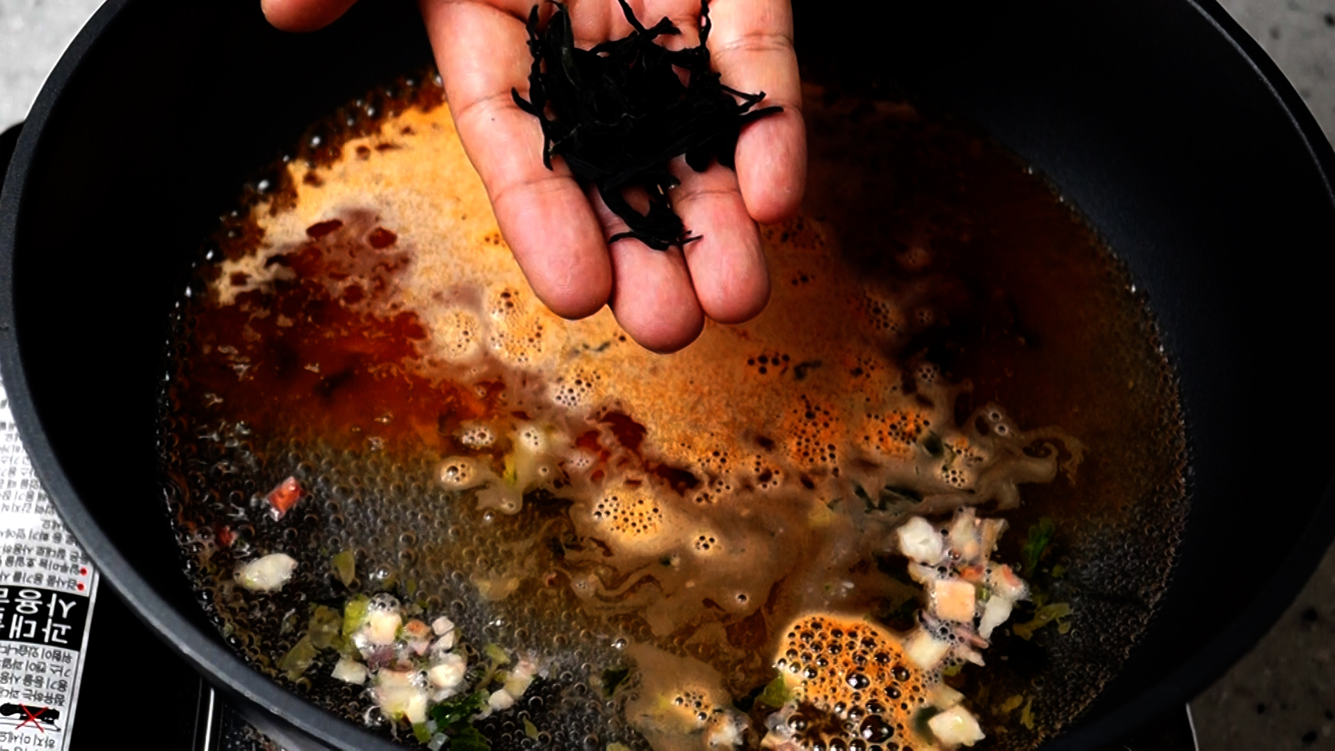 3. 건미역을 부드러운 부분 위주로 조금만 넣어주세요. 국물의 풍미가 확 살아 납니다~ 이건 비법이 아니에요^^ 그냥 거드는 조연을 소개한것일뿐!