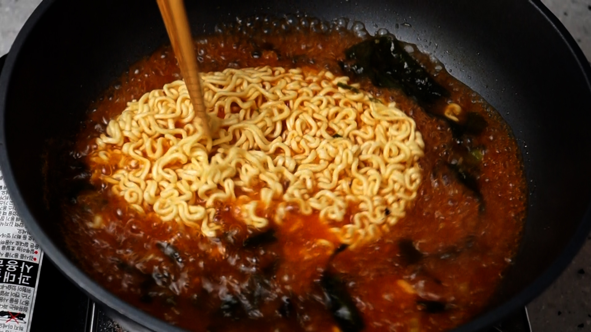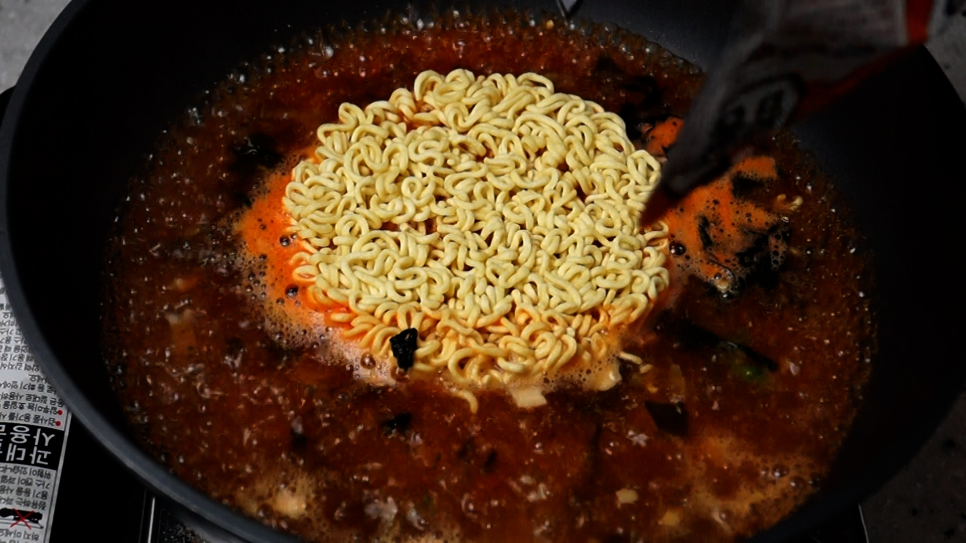 5. 곧바로 면을 넣고 봉지에 남은 부스러기도 털어넣는거 잊지마시고 설명서에 적힌 시간 만큼 끓여주세요!