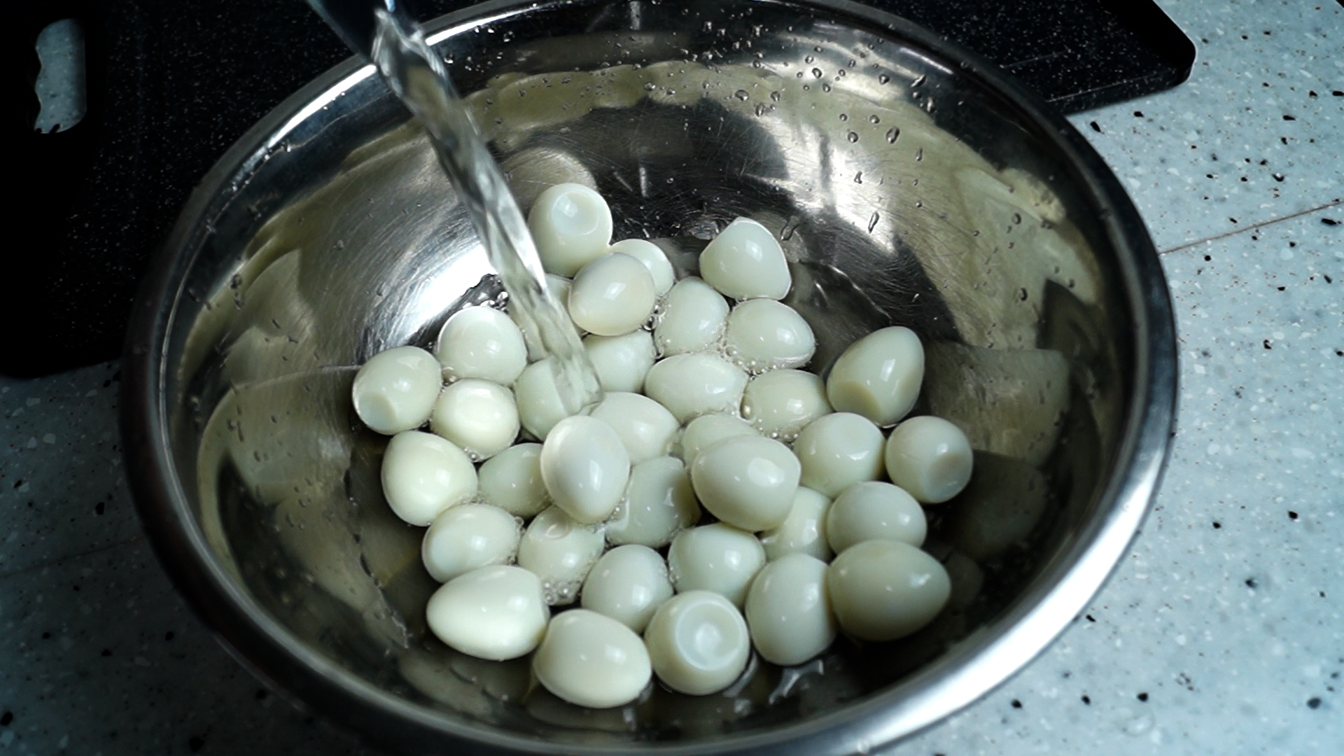 3. 깐메추리알을 찬물에 1번 헹궈주세요. 제거 되지 않은 껍질이 남아 있는 경우가 종종있습니다.