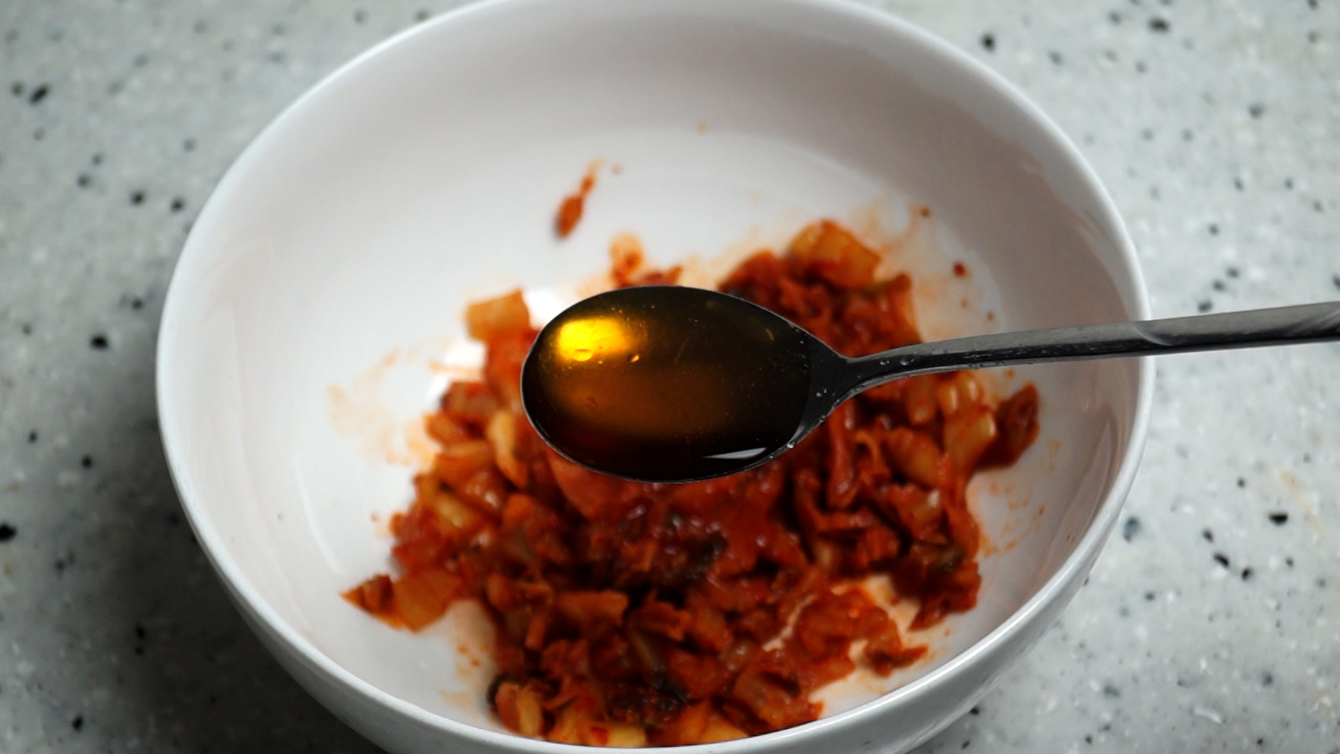3. 렌지용 내열용기에 다진 김치를 넣고 김치국물 1스푼 을 부어주세요.
