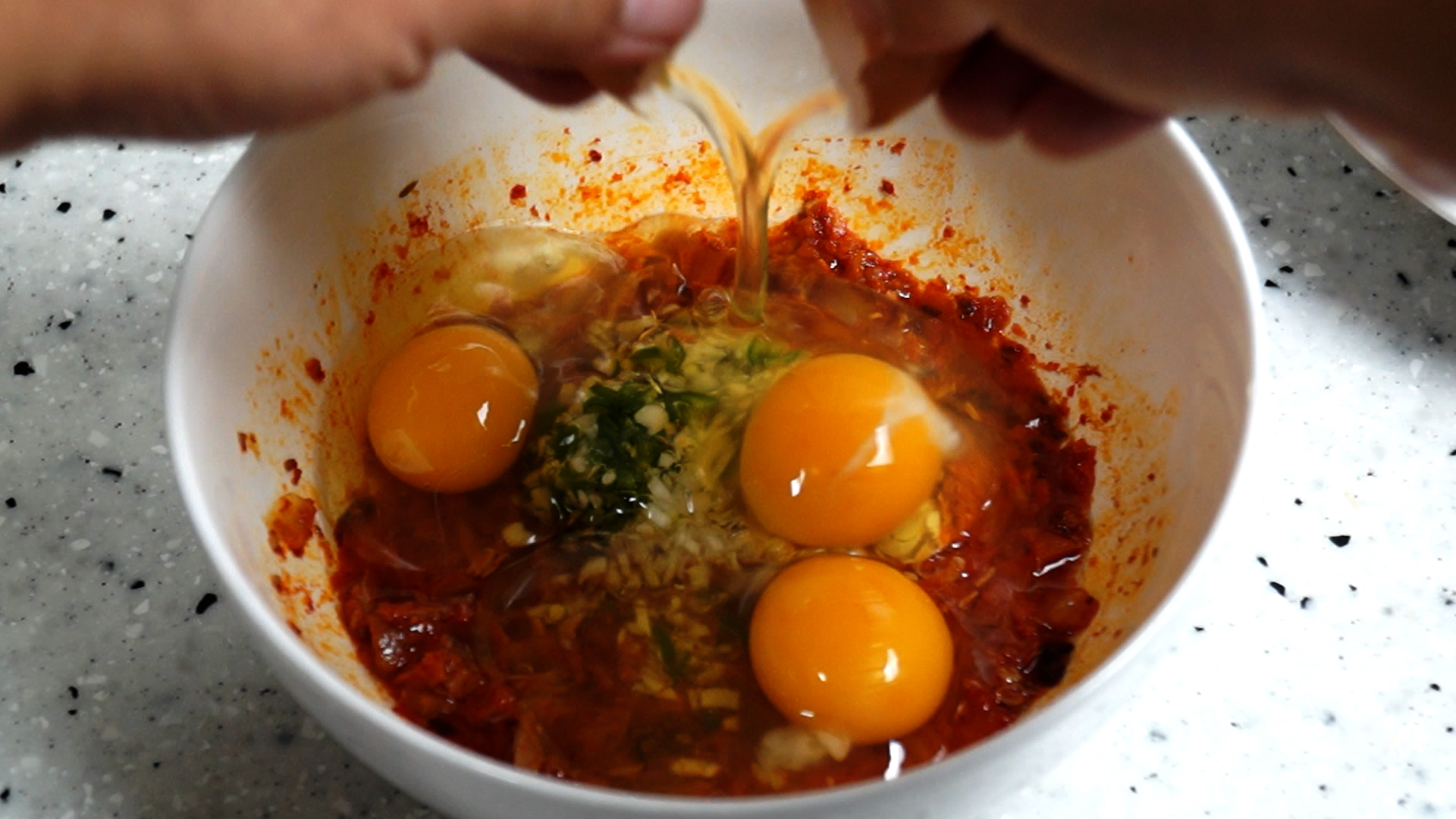14. 아까 김치자른 가위로 계란물을 섞으면서 가위질을 하면 노른자 흰자가 제법 잘 섞입니다.