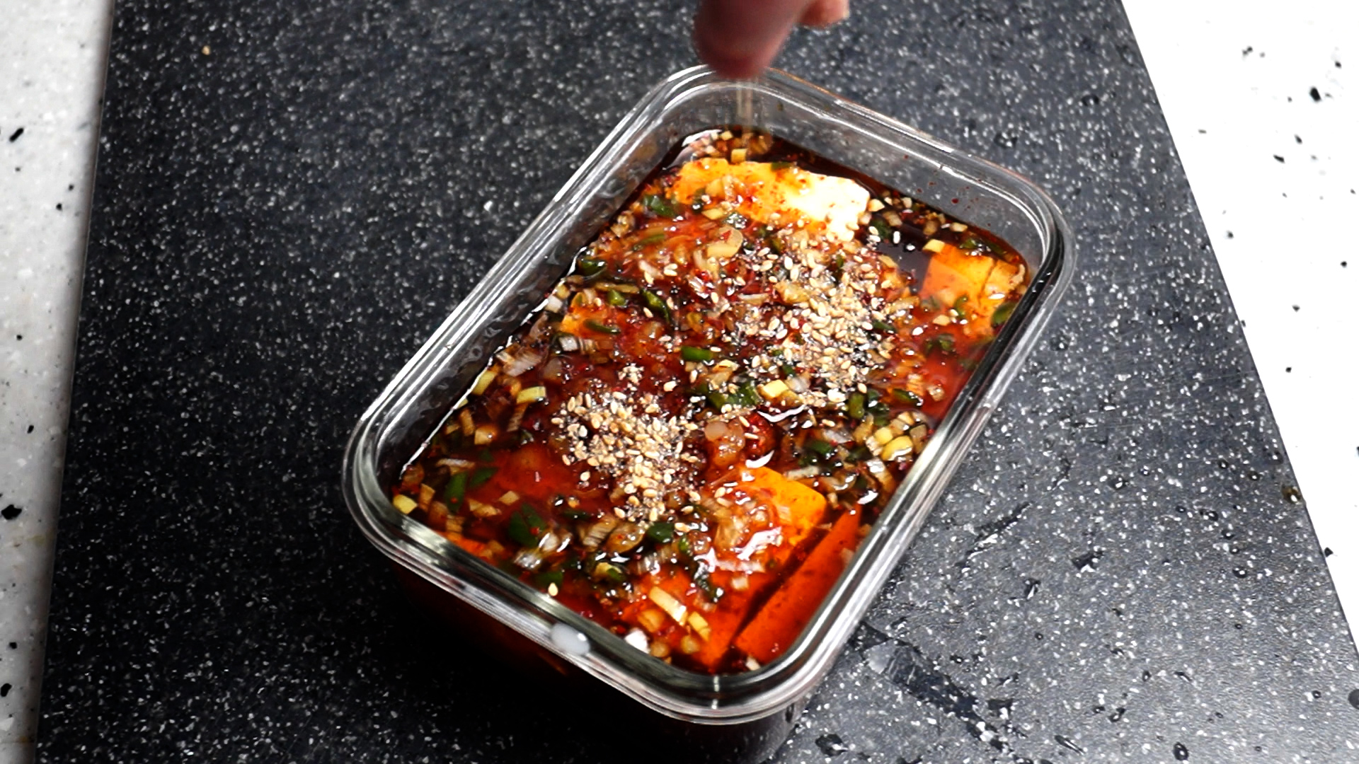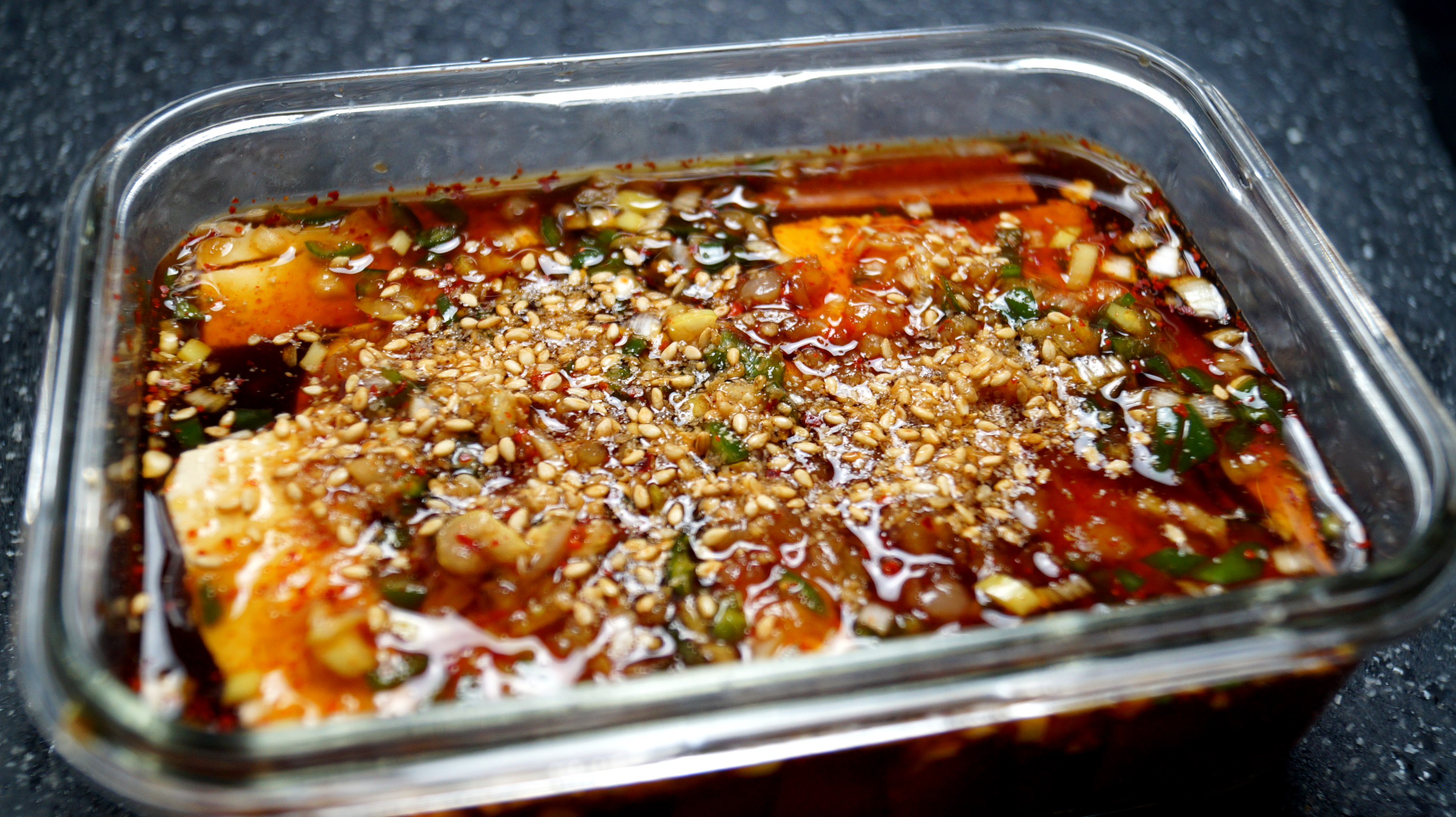 7. 두부에 양념을 전부 들이 부어주세요. 혹시 두부를 일주일 이상 놓고 두실려면 두부를 끓는 물에 2~3분 데쳐서 사용하세요.