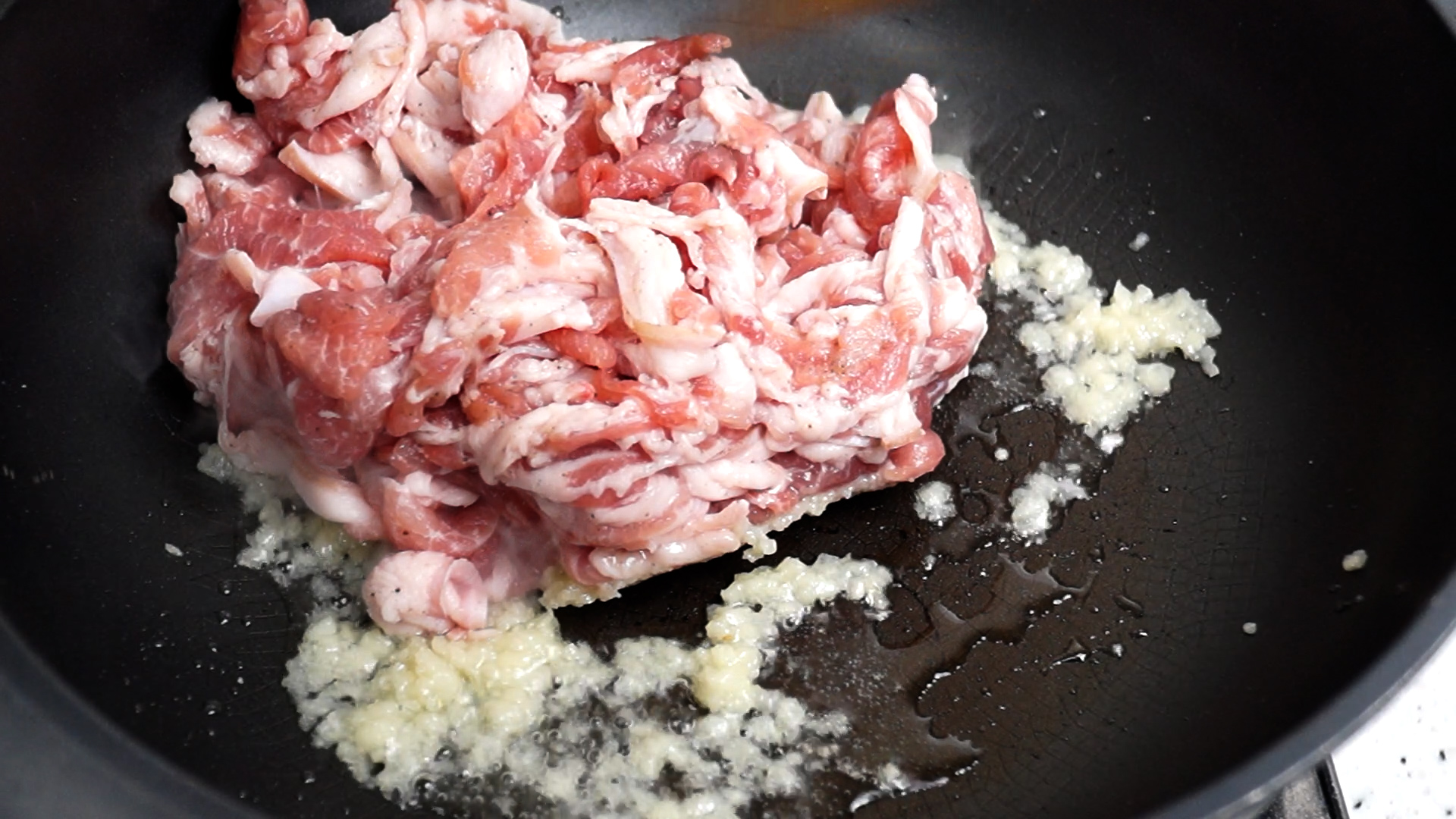 7. 팬에 마늘과 식용유를 넣어주시고 불을 약불로 올려주세요.