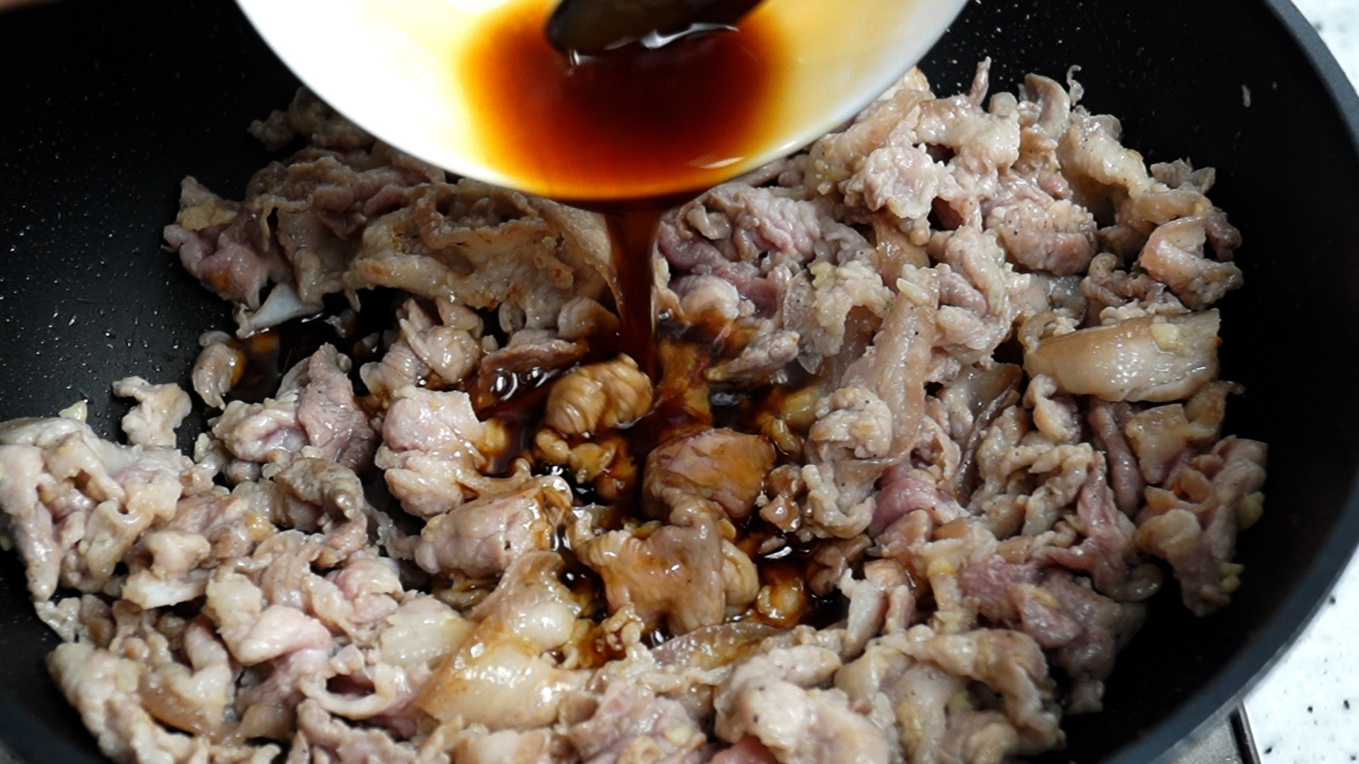 11. 강불에 2~3분 볶아서 고기가 80% 이상 익었으면 양념을 부어주세요.