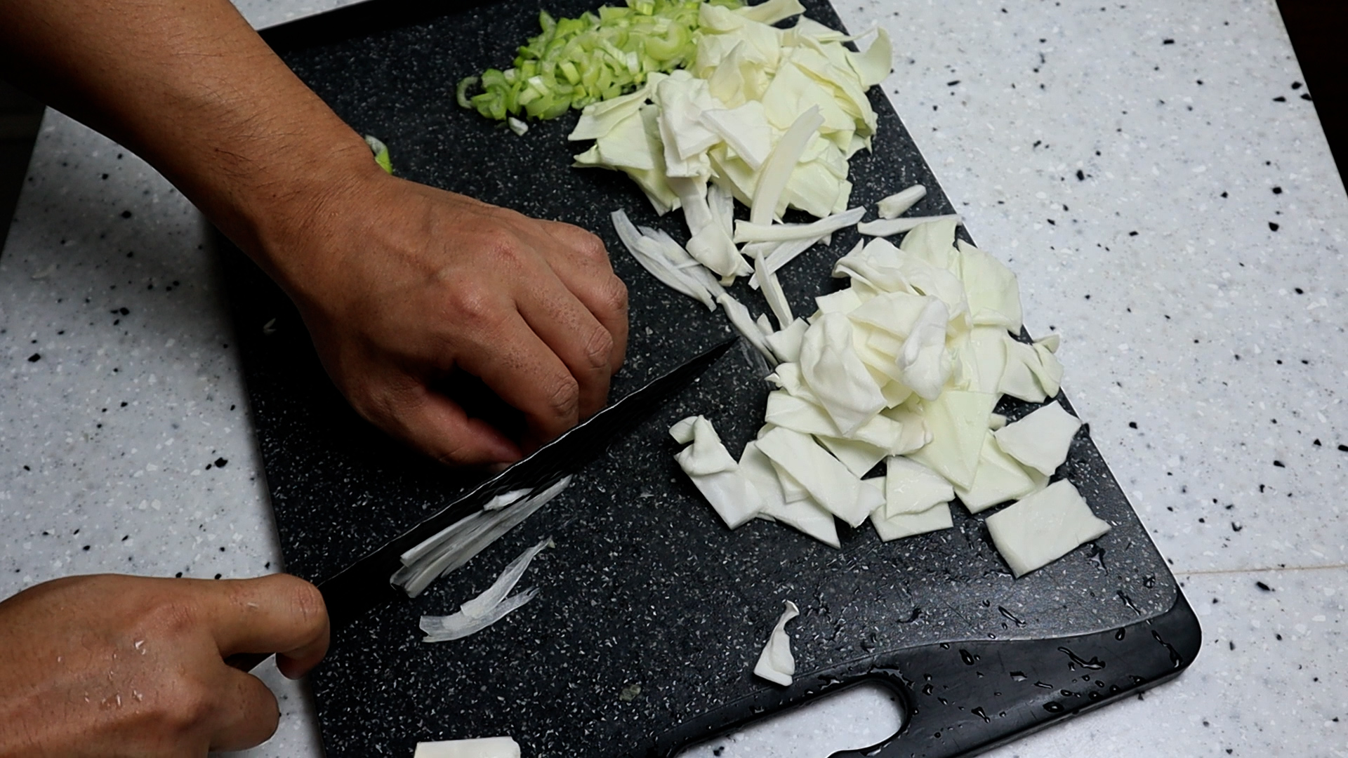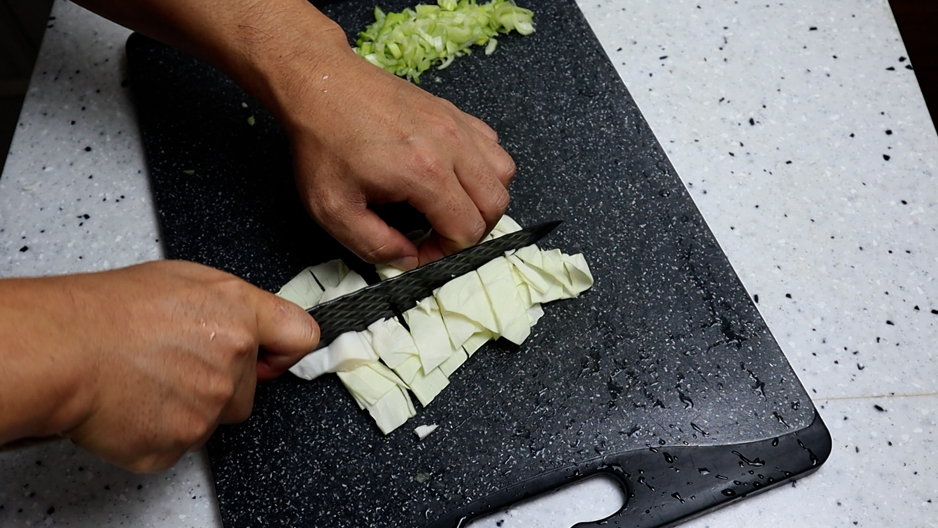 10. 양배추는 3~4cm 크기가 나오게 조금크게 썰어주세요. 볶으면서 부피가 줄기도 하고 크기가 좀 있어야 씹는 식감도 살아있습니다.