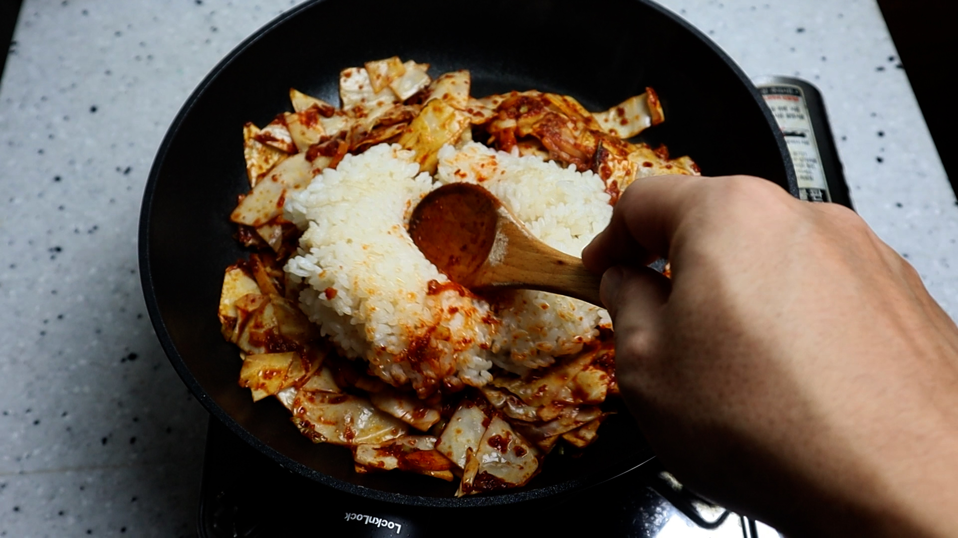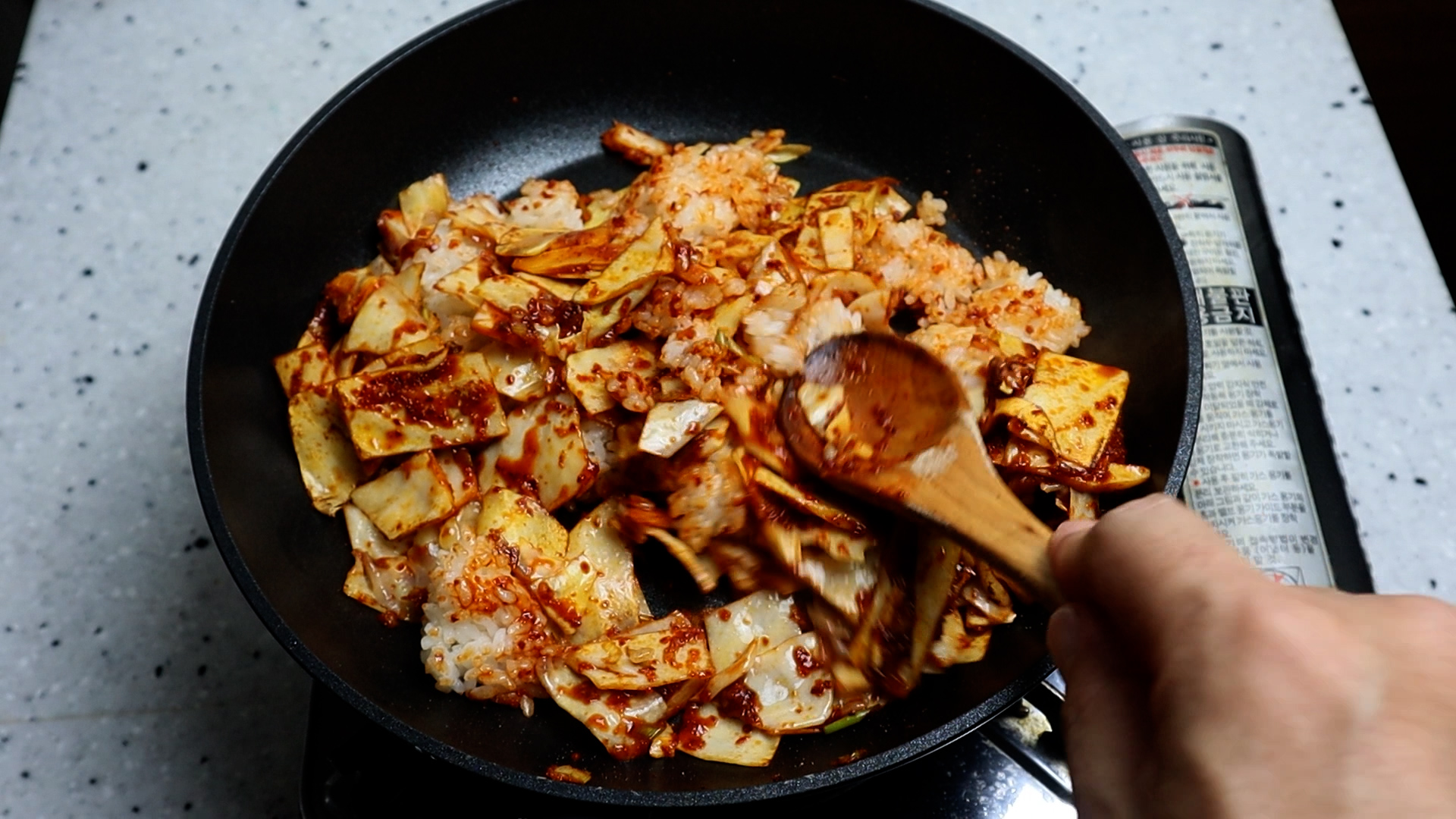21. 20초 후 골고루 섞으면서 10초 정도 볶다가 또 한번 골고루 펼쳐서 20초 정도 가만히 두면서 밥을을 눌려줍니다. 밥과 양념이 타지 않는 한도내에서 2~3차례 이걸 반복하면 2배는 맛있어 진답니다.