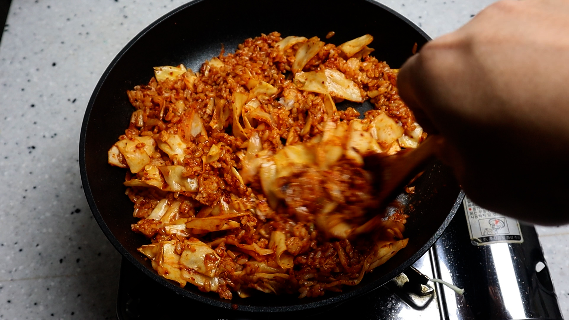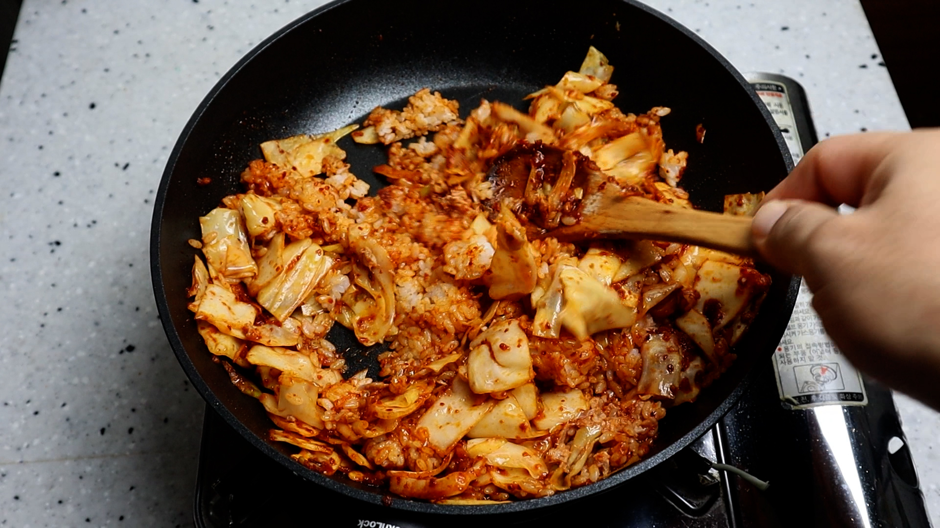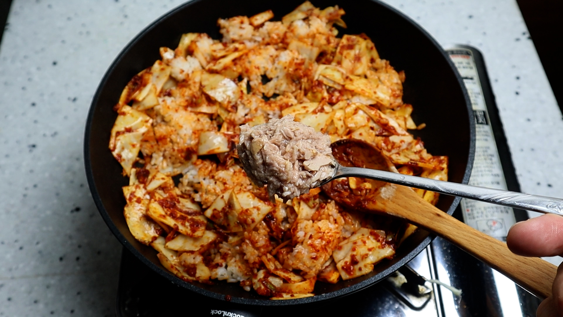 18. 밥을 20~30초 볶아서 양념과 골고루 섞은 다음에 참치를 넣어주세요. 햄을 넣으실거면 양배추 넣을때 같이 넣고 볶아주세요.