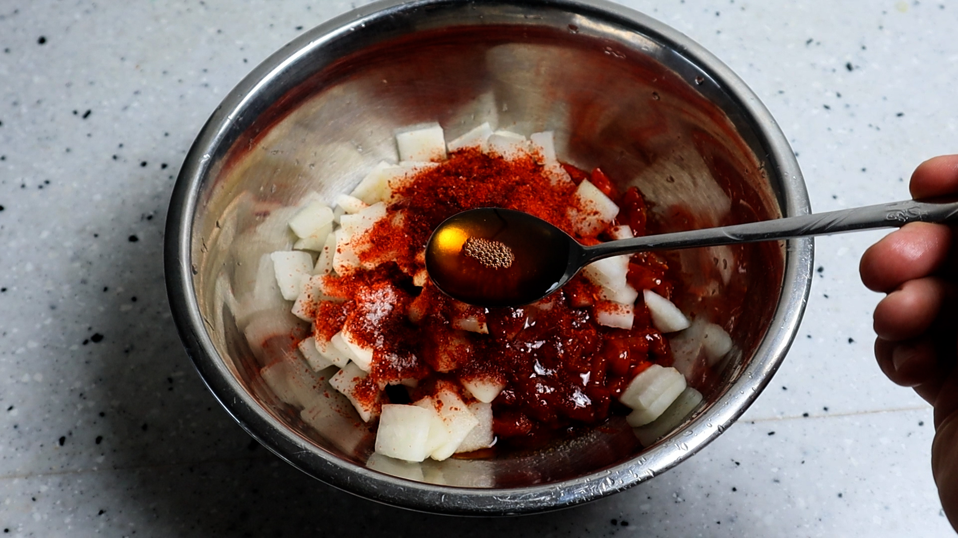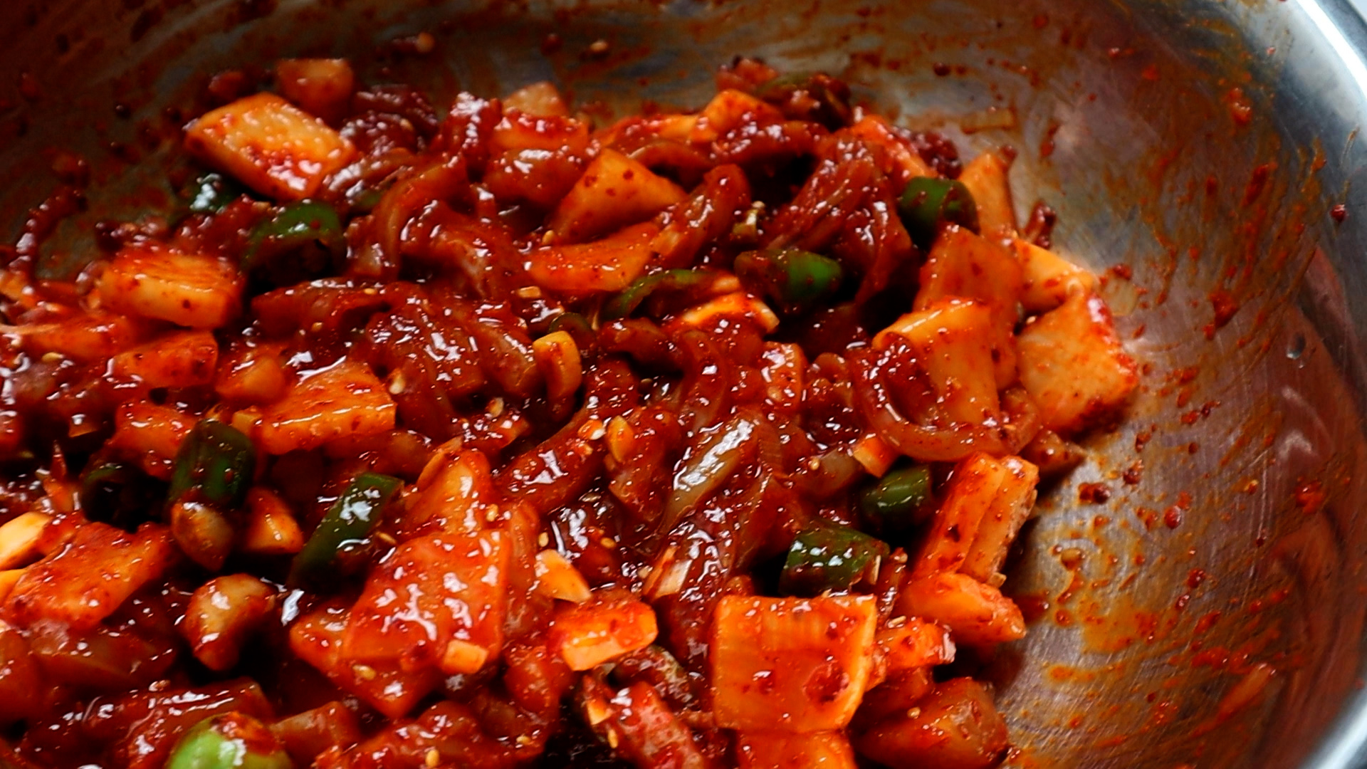 10. 무우와 젓갈에 양념 재료들을 분량껏 넣어주세요.