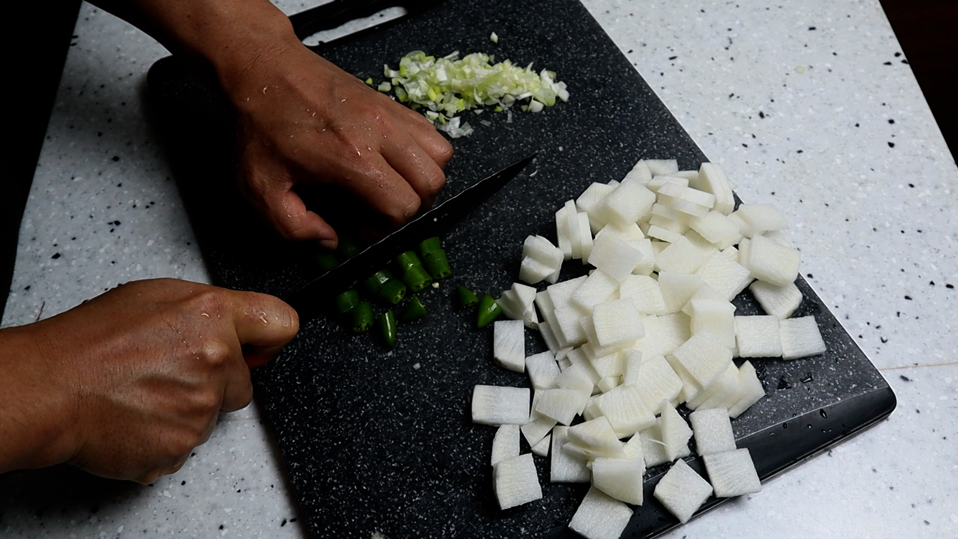 2. 3~4mm 두께로 썬 무우는 기호에 맞게 먹기 좋은 크기로 잘라주세요.
