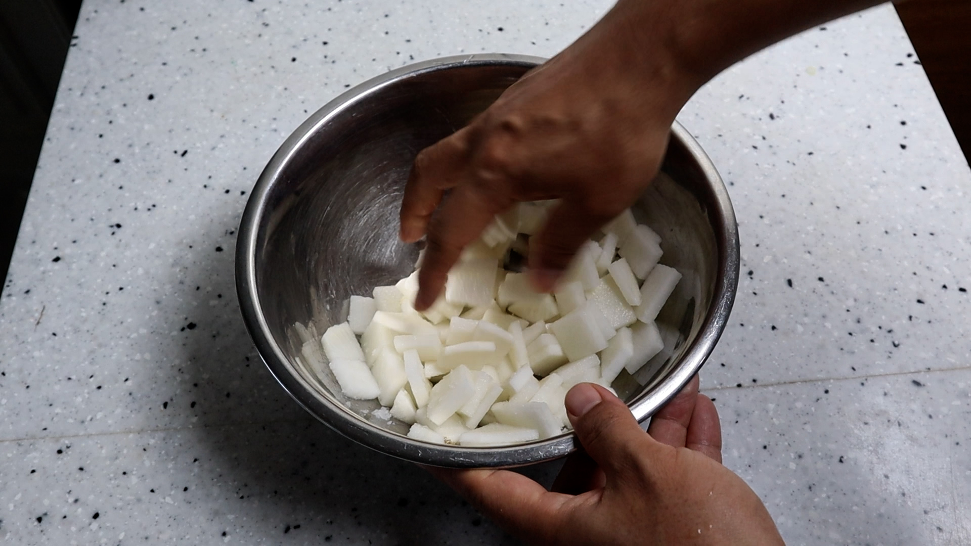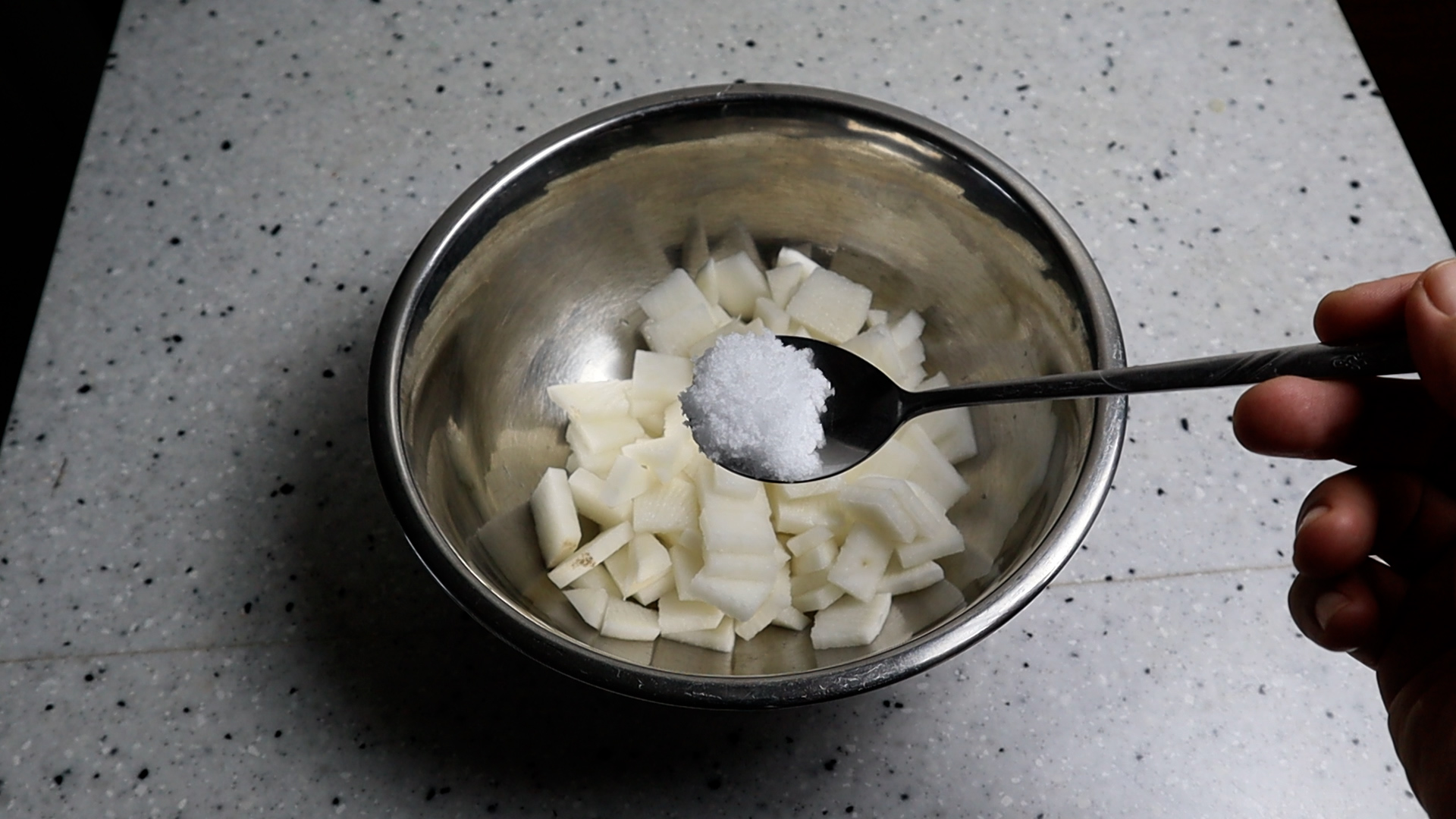 5. 무우를 볼에 담고 꽃소금 반스푼을 뿌려주세요. 여름무우 처럼 쓴맛이 많으면 설탕과 식초를 적당량 가미해보세요.
